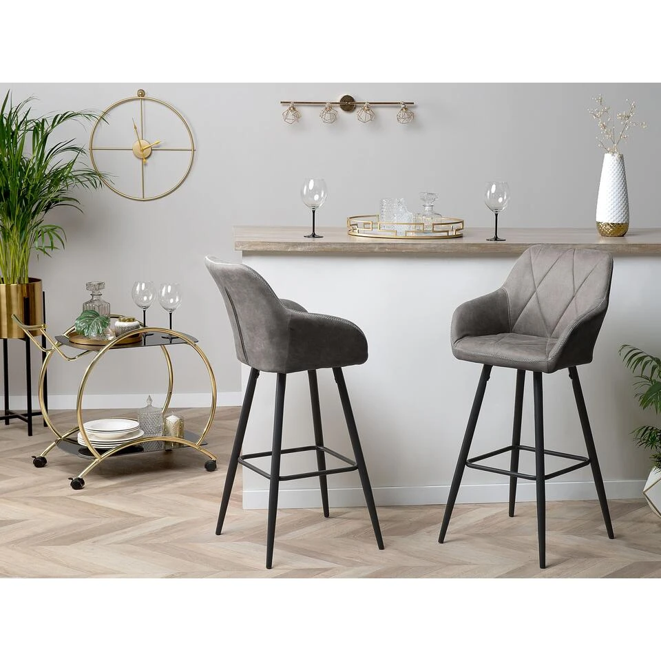 Praktische set van 2 in een moderne look. Verrijk je interieur met deze moderne set barkrukken. Of het nu voor de bar van je open keuken of in de overgangsruimte is, deze barkrukken vervullen hun functie overal en zien er tegelijkertijd ook nog eens heel stijlvol uit. De gepoedercoate, zwarte poten geven een mooi contrast met het grijs van de bekleding en zorgen ook voor een stabiele voet.