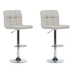 Elegante en klassieke barkrukken in beige in een set van 2. Kijk uit naar het volgende gelukkige cocktailuurtje met lieve vrienden, leuke gesprekken en een unieke zitervaring. Deze elegante en klassieke barkrukken in een set van 2 bieden uitstekend zitcomfort dankzij de in hoogte verstelbare stoel, aangename bekleding, brede voetsteun en comfortabele rugleuning. De onderhoudsvriendelijke hoezen van duurzaam polyester in mooi beige hebben een vierkant gewatteerd patroon en de verchroomde metalen frames hebben elk een brede, ronde voet, die zorgt voor een veilige en antislip standaard.