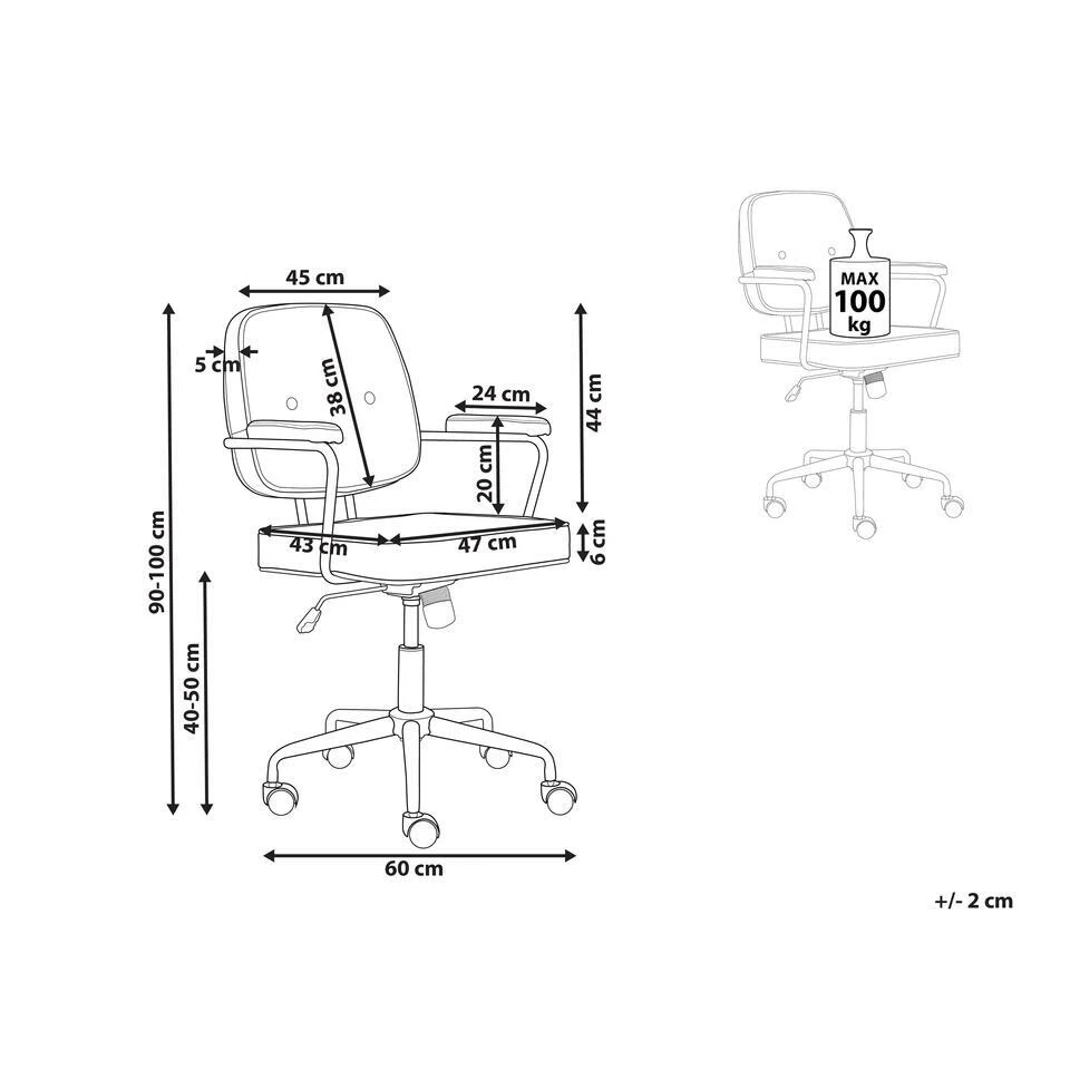 Verstelbare draaibare bureaustoel. Fris je kantoorruimte op met deze functionele bureaustoel. Het beschikt over een 360° draaimechanisme en een gasveer waarmee je de hoogte kunt aanpassen aan je voorkeuren. De stoel is bekleed met duurzaam kunstleer en heeft een gecapitonneerde rugleuning en gewatteerde armleuningen en zitting voor een eenvoudige maar elegante afwerking. Verchroomde metalen poten en basis maken het stuk stabiel en duurzaam. De stoel past goed in traditionele en moderne interieurs.