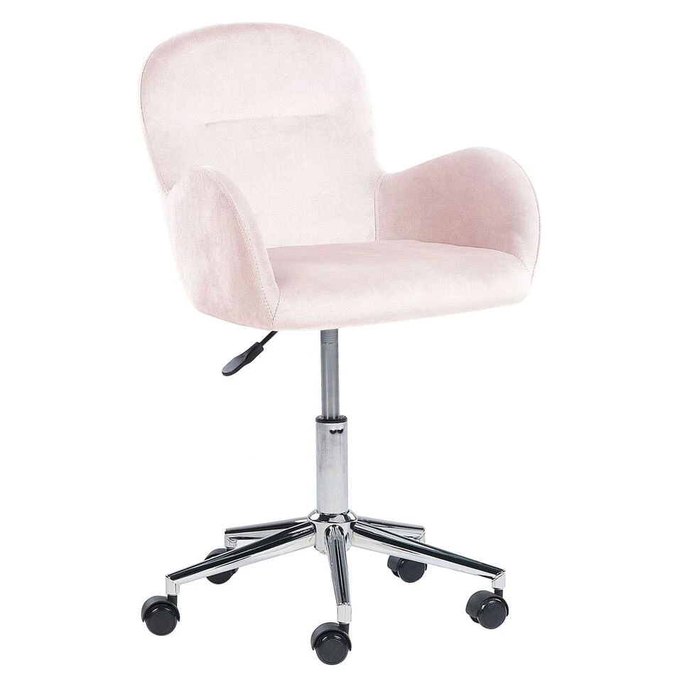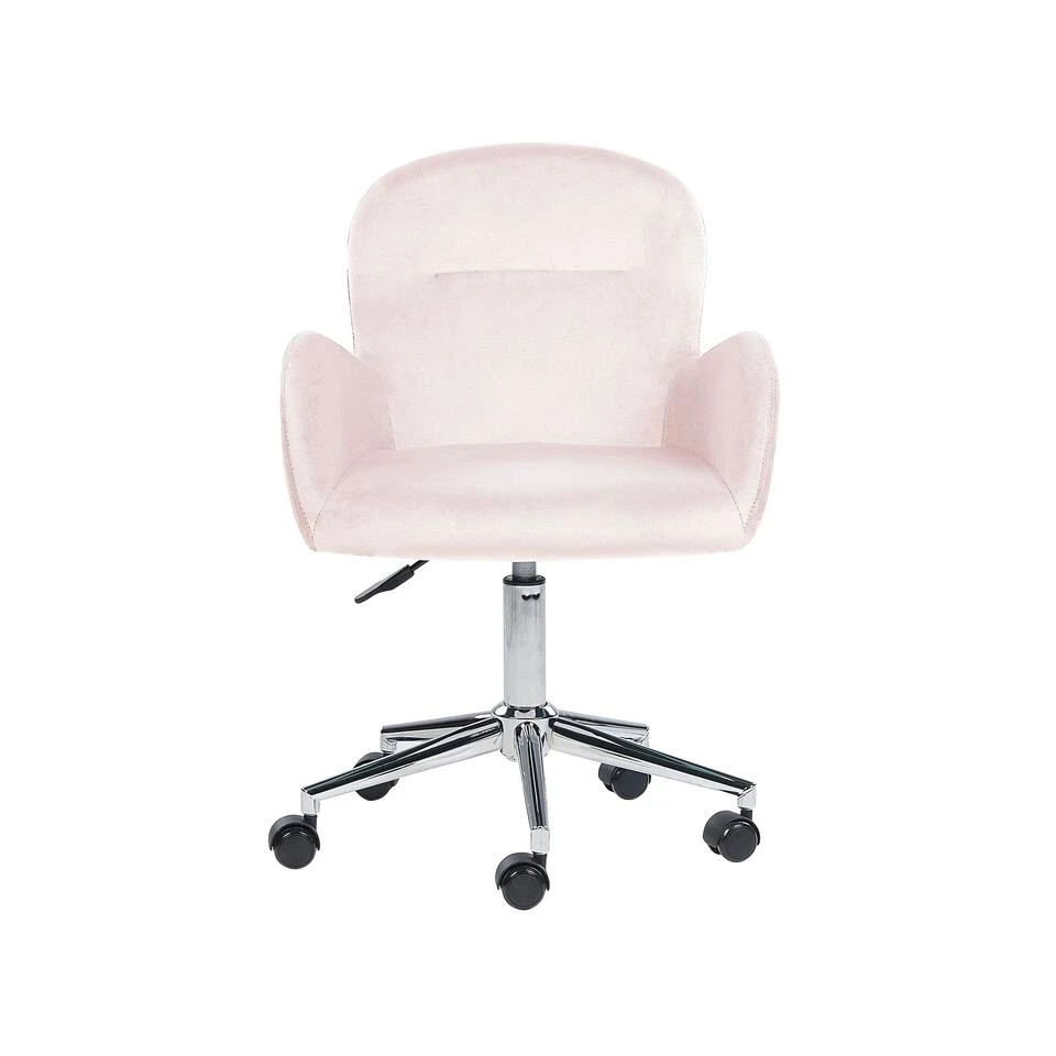 Gestoffeerde stoel met armleuningen. Upgrade de uitstraling van je kantoorruimte door er een comfortabele fauteuil met een gezellige uitstraling aan toe te voegen. De brede en dik gecapitonneerde zitting is bekleed met fluwelen stof in een prachtige kleur die mooi overeenkomt met de retro-geïnspireerde vorm van het meubel. Het duurzame metalen onderstel garandeert stabiliteit en dankzij de ingebouwde wielen en de gasveer kun je het meubel gemakkelijk aanpassen aan je behoeften.