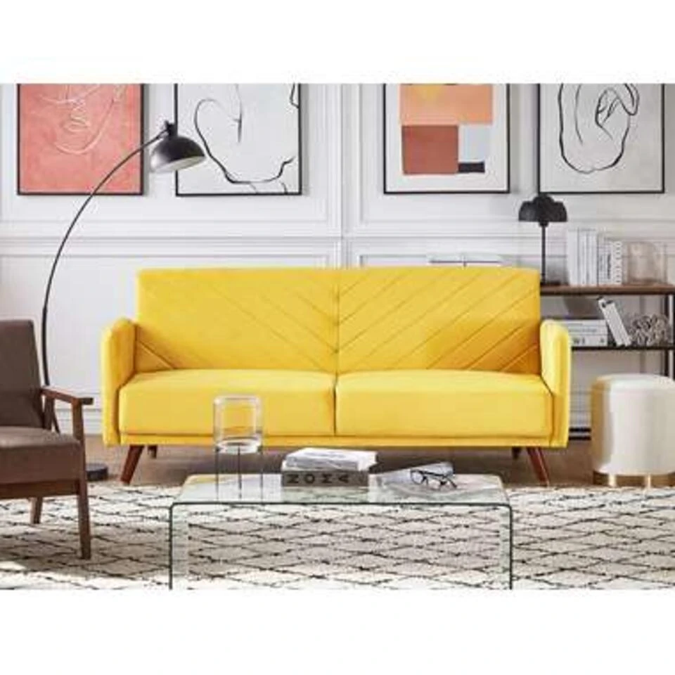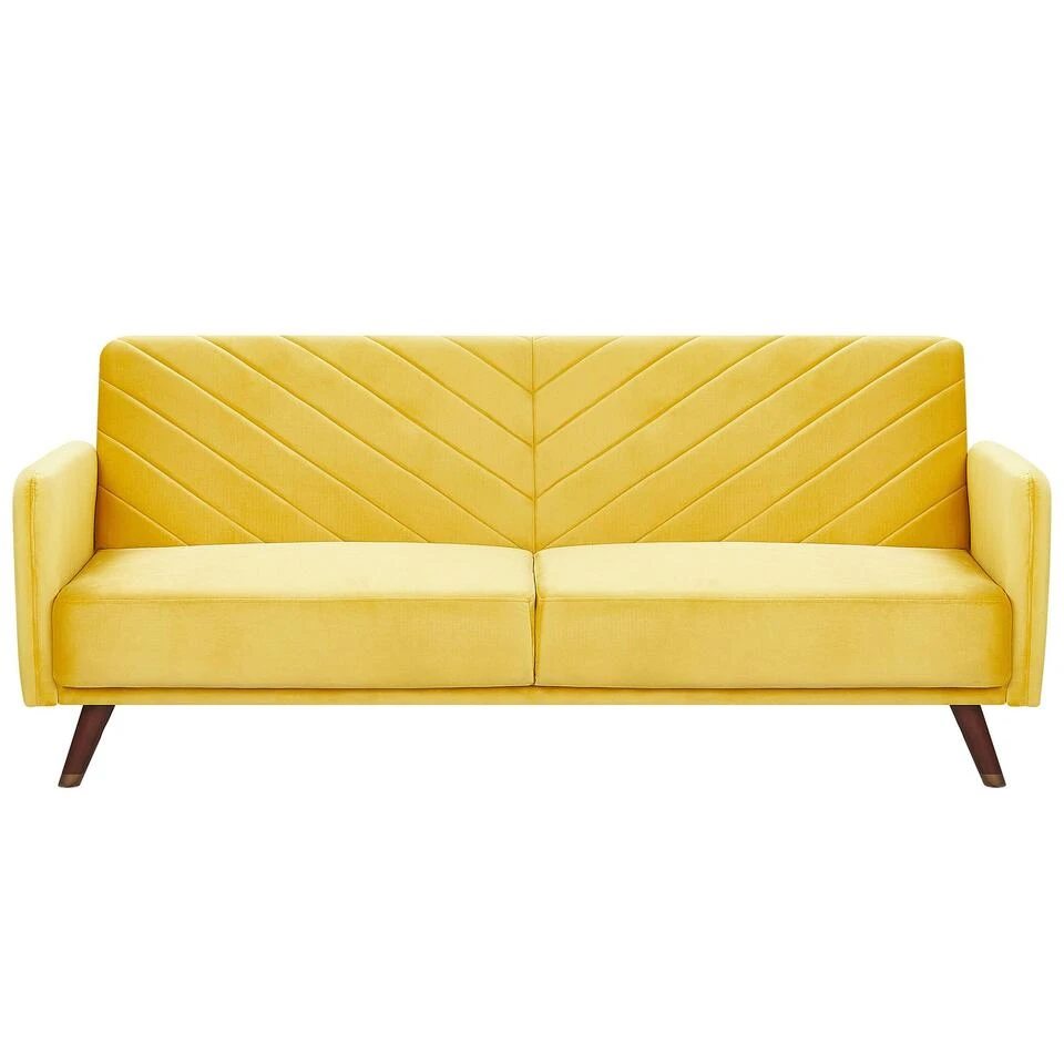 Velvet bank geel. Deze slaapbank past in elke woonkamer en past goed bij verschillende interieurstijlen, of het nu gaat om glamour, modern of mid-century. Het diagonale stikpatroon op de verstelbare rugleuning en de rubberhouten poten in donkere walnoottint geven de bank een Scandinavische uitstraling. Bekleed met zacht aanvoelende, fluwelen polyesterstof, ziet de bank er gezellig en uitnodigend uit. Dikke, met schuim beklede kussens zorgen voor het grootste comfort. Dankzij de slaapfunctie doet hij het ook perfect als logeerbed of als plek om een dutje te doen.