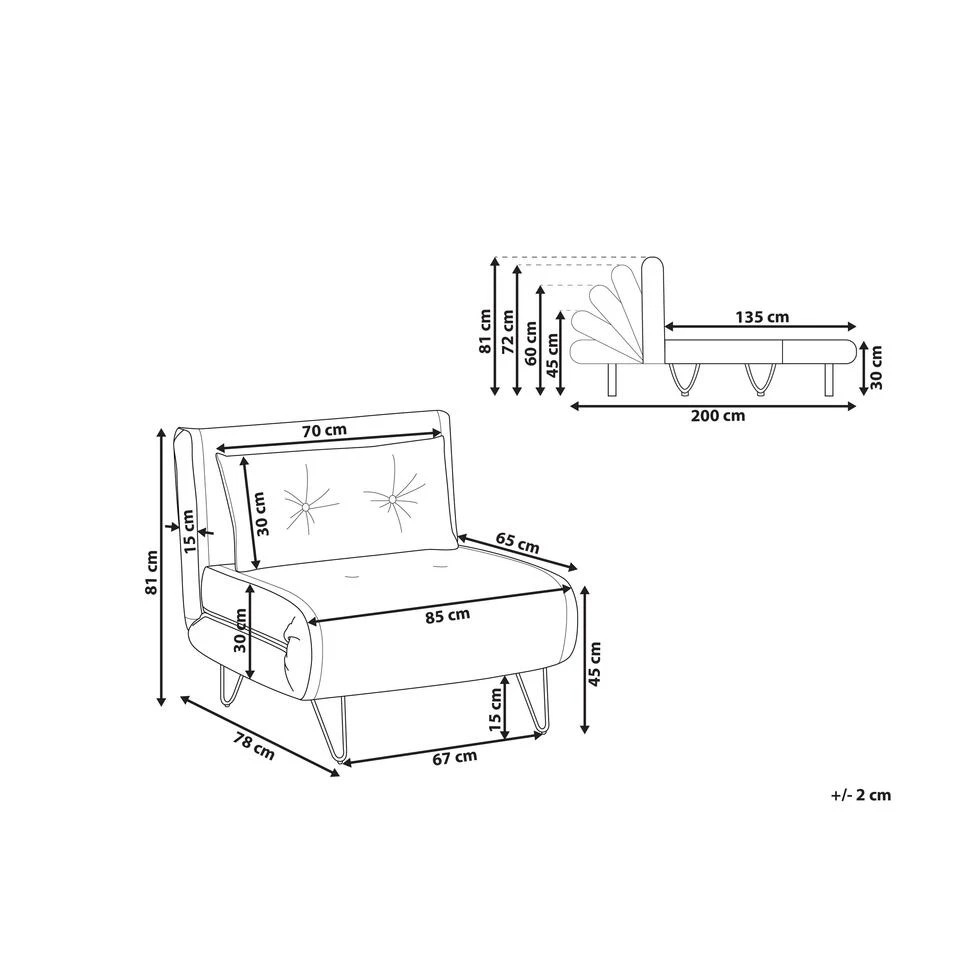 Belangrijkste eigenschappen: Zeer gemakkelijk te veranderen in een bed, Rugleuning in 5 posities verstelbaar, Retro Stijl, Elegant accentstuk, Versiert met knoopdetails, Zijdezacht, fluwelen stof, Verwijderbare kussenhoezen, Verstelbare rugleuning