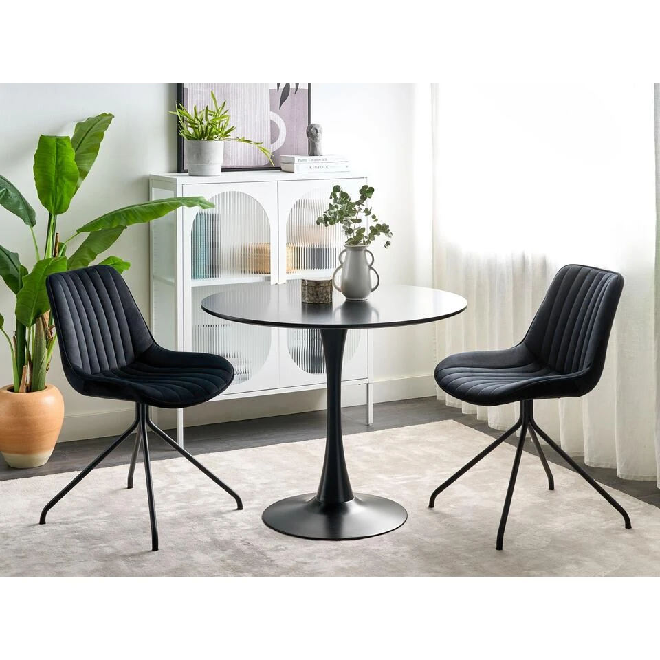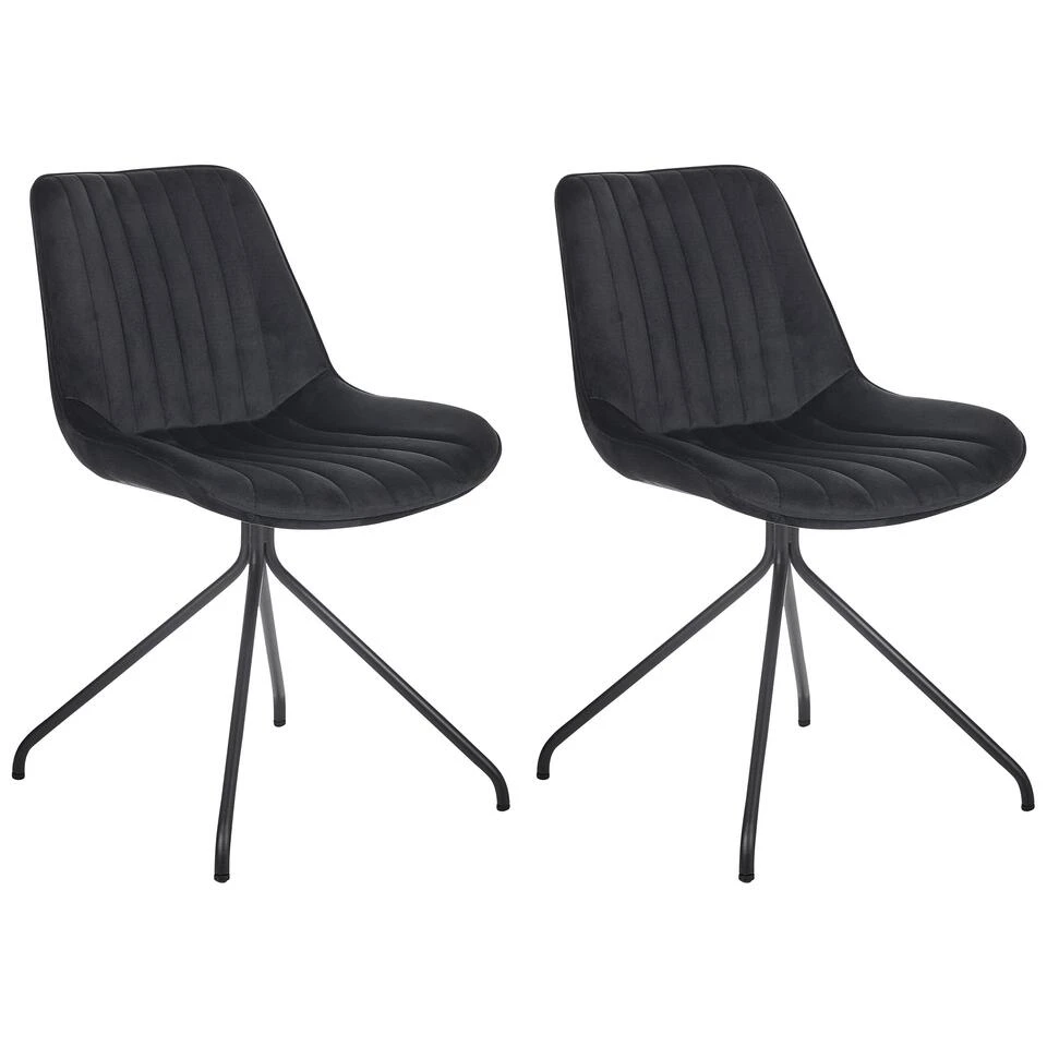 Set van gestoffeerde stoelen. Vernieuw je eetkamer met deze set gestoffeerde stoelen en creëer een glamoureuze sfeer. De stoelen zijn gemaakt van duurzaam fluweel, waardoor beide stoelen zacht zijn. Dankzij hun kruisvormige basis van staal zijn ze ook zeer stabiel. De gestoffeerde rugleuningen en licht gebogen zittingen zullen zeker de aandacht trekken en garanderen het hoogste comfort tijdens het dineren.