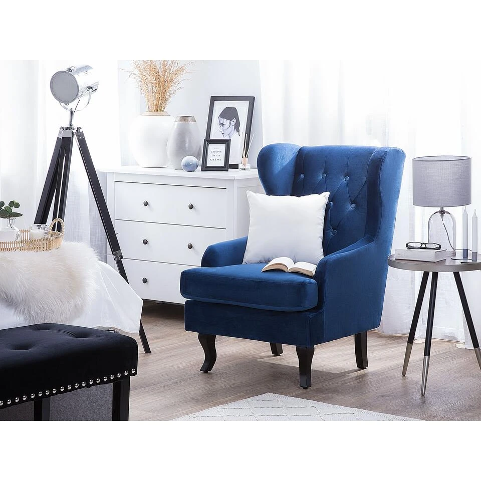Fauteuil van donkerblauw fluweel. Deze salonfauteuil is, dankzij de comfortabele bekleding, moeilijk te overtreffen als het gaan om comfort. Of het nu gaat om een leesstoel of een tv-stoel – deze gezellige oorfauteuil maakt indruk met zijn zithoogte en zijn licht hellende rugleuning. De gebogen en donkere houten poten en de lange rugleuning geven de beige salonstoel iets majestueus. De opzettelijk geplaatste knopversieringen op de rugleuning ronden het elegante ontwerp van de stoel af.