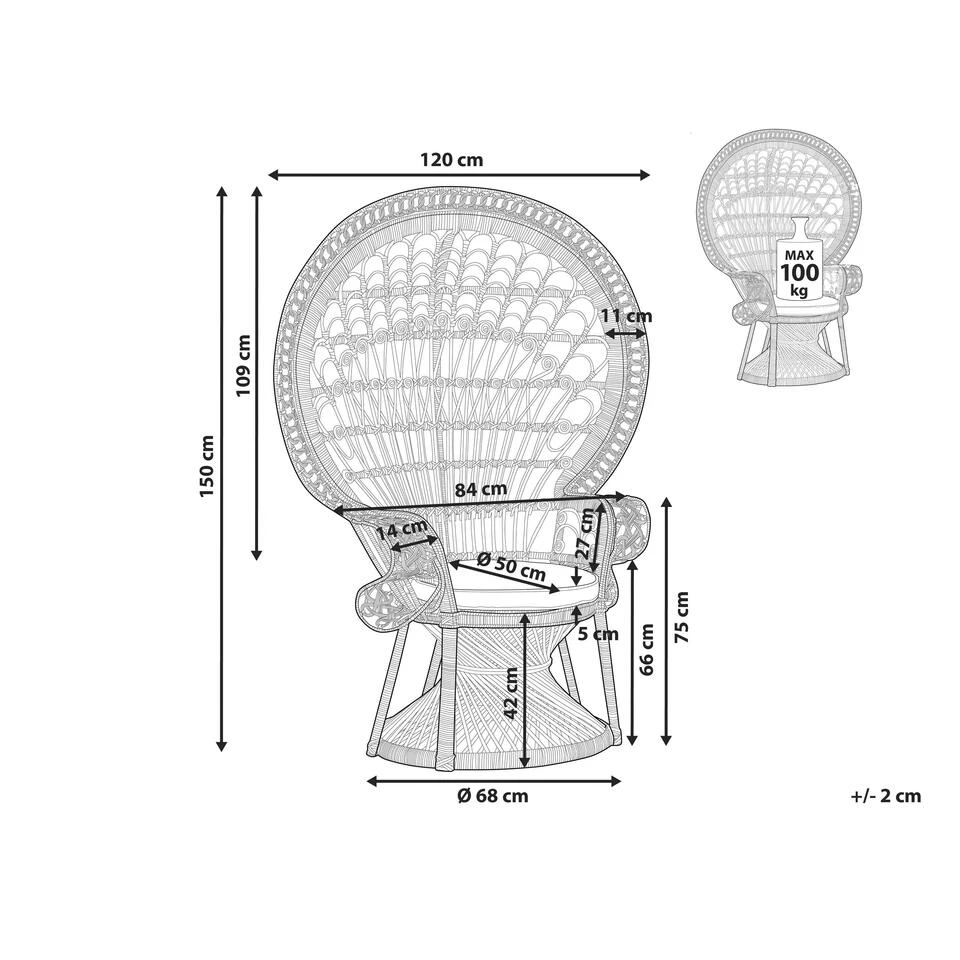 Volumineuze pauwenstoel van wit rotan. Het meest onderscheidende meubelstuk uit de jaren 60 en 70 is terug en is nog steeds stijlvol. De romantische en speelse waaiervormige rugleuning, doet denken aan een wijd open verenstaart van een pauw, is een ultieme blikvanger en geeft de fauteuil een majestueus en dromerig karakter. Dankzij de prachtig geweven rotan details wordt de stoel het middelpunt van elke boho ingerichte woonkamer.