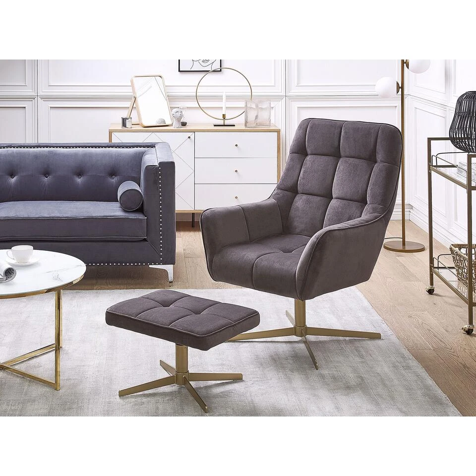 Elegante,gestoffeerde relaxstoel met bijpassende hocker. Deze relaxfauteuil met hocker is perfect voor bij de televisie. De fauteuil heeft een hoge, comfortabele rugleuning die uitnodigt tot ontspannen leesuren. De bijpassende kruk is ideaal als opbergvlak of om je voeten comfortabel op te leggen. Het goudkleurige frame geeft een vleugje glamour en maakt deze set tot een echte blikvanger in iedere woonkamer.