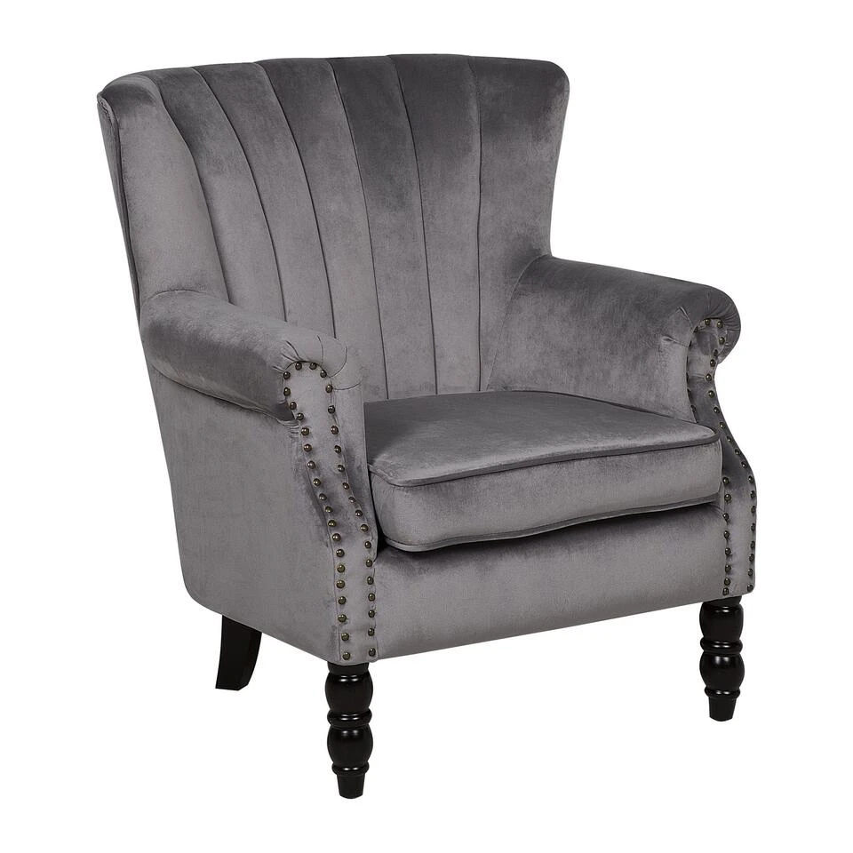 Grijs gestoffeerde fauteuil. Leun achterover en geniet van het moment in onze feel-good stoel. De twee voorste poten van rubberhout harmoniëren met de fluwelen zachte bekleding in grijs. Het hoogtepunt – de subtiele knopversiering op de armleuningen.
