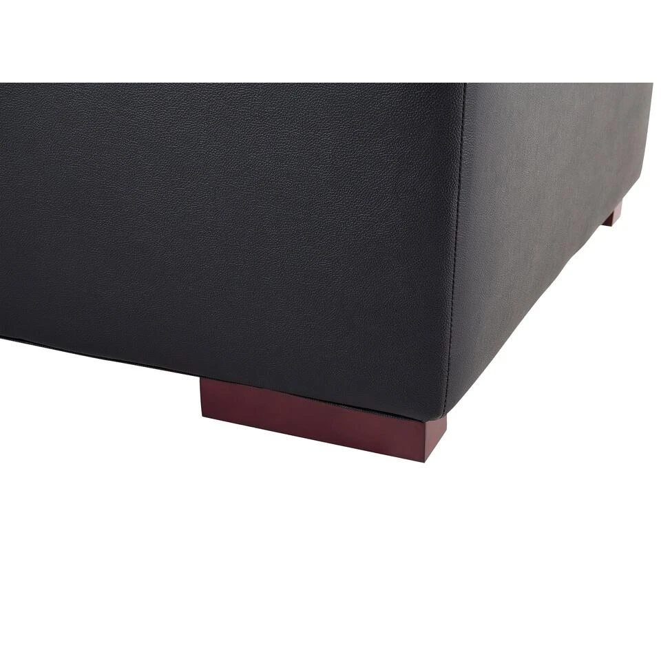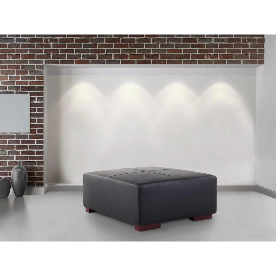 vierkant zwart leer Ottomaan. Deze zwartkleurige ottomaan is even veelzijdig als stijlvol. Je kunt er heerlijk op zitten, je kunt de hocker gebruiken als voetenbank of als bijzettafeltje om een dienblad met hapjes en drankjes op te zetten. Het zitvlak van de elegante poef heeft een cover van fijne koeienhuid, andere delen van de omslag zijn gemaakt van synthetisch leer. Dit zachte materiaal biedt een aangenaam zitcomfort. De hocker heeft geen naden, is onderhoudsvriendelijk en robuust. Vlekken veeg je er zo vanaf. De stevige poten van rubberboomhout zorgen ervoor dat je stabiel zit.