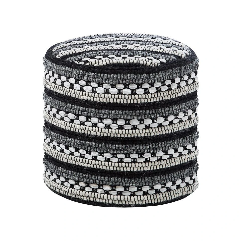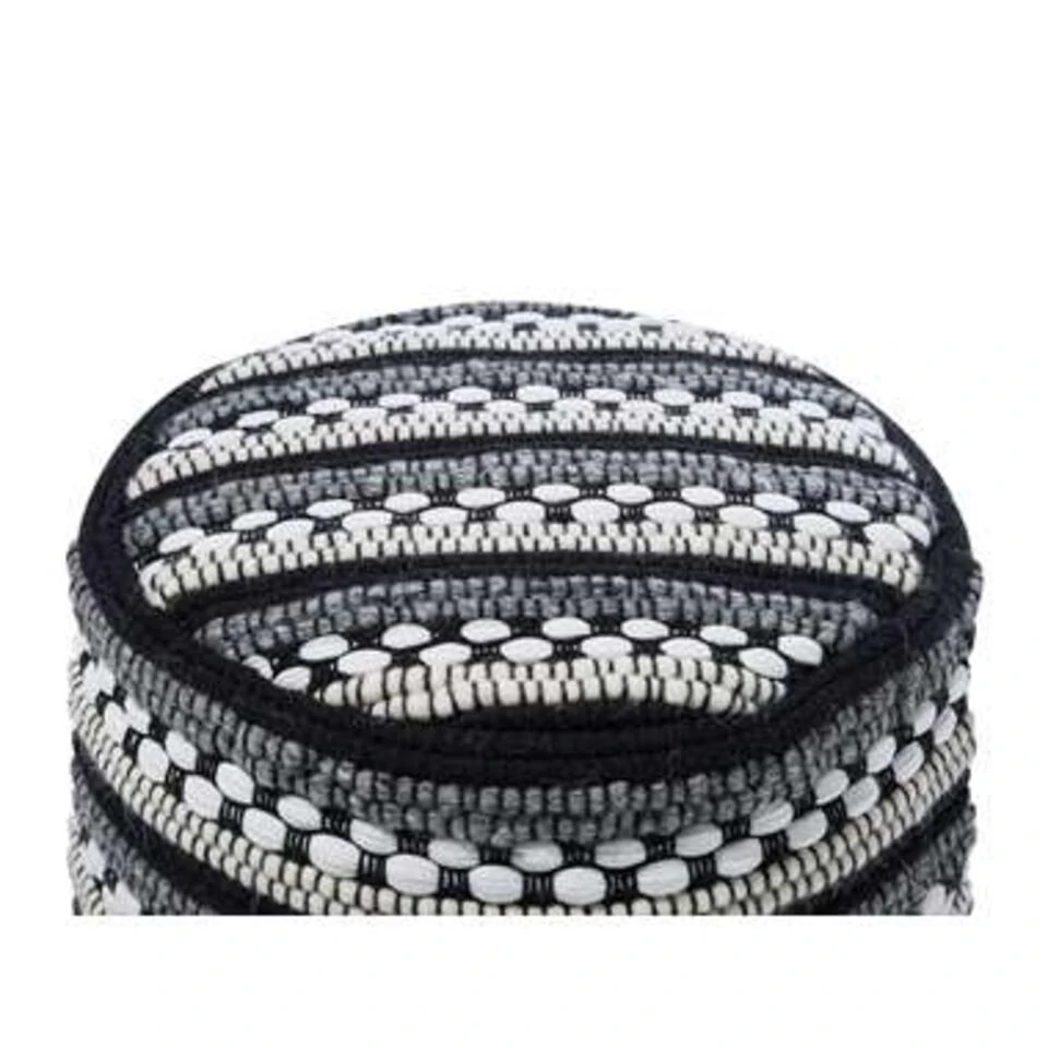 Ronde poef met zwart-wit patroon. Deze handgemaakte poef in gebreide look geeft elke kamer een gezellige sfeer met een vleugje boho-stijl. Het zachte oppervlak van een mix van wol en katoen garandeert een aangenaam zitgevoel en het streeppatroon in verschillende zwarte tinten geeft de poef een decoratieve touch.