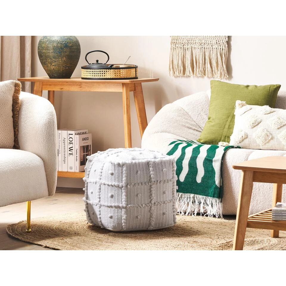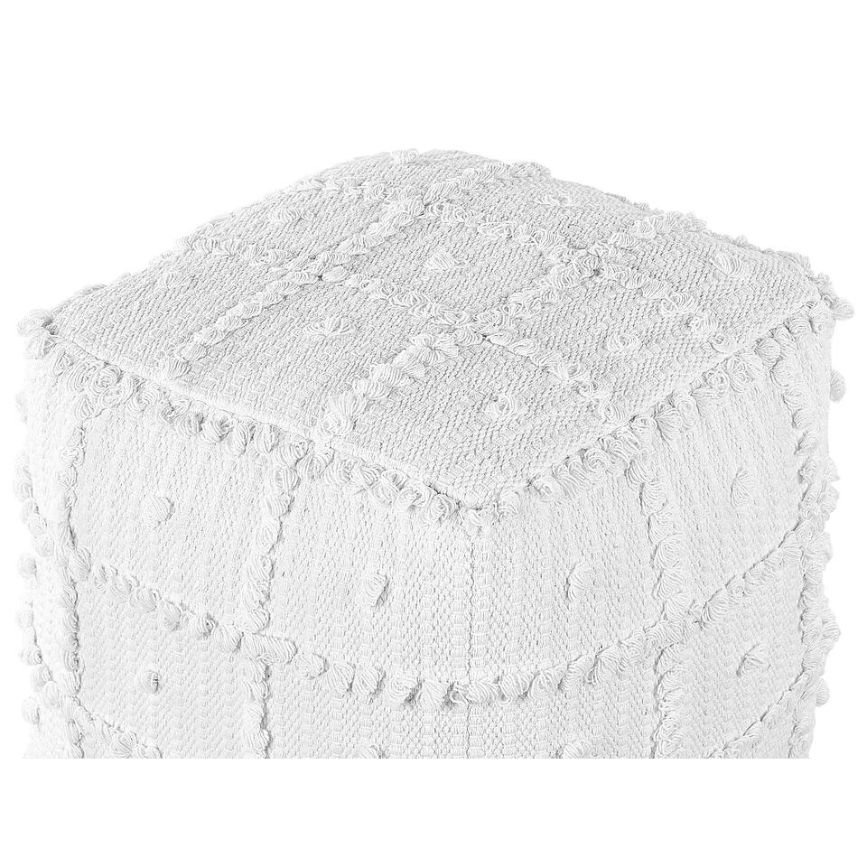 Vierkante woonkamer ottomaan met geometrisch patroon. Deze multifunctionele poef biedt een extra zitplaats en is ook een mooi decoratief accentstuk. Het geometrische patroon en de unieke structuur maken het tot een eyecatcher in elk interieur. Handgemaakt van wit katoen en EPS-balletjes, zal hij prachtig staan in een moderne of traditionele woonkamer, maar is ook perfect voor een kinderkamer. Dankzij de ritssluiting is hij eenvoudig schoon te maken.