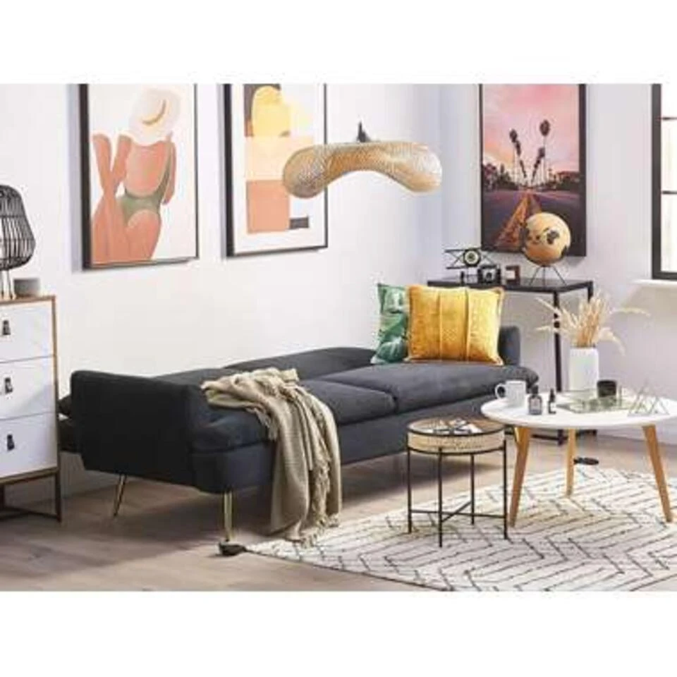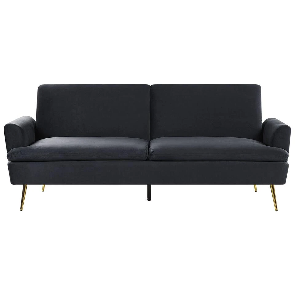 Zwarte fluwelen slaapbank. Deze slaapbank bekleed met een heerlijke velvet stof heeft een minimalistische en moderne vorm. Juist hierdoor past hij goed bij ieder interieur en in elke stijl. Overdag kan hij gebruikt worden als tweezitsbank, ’s avonds maak je er in een handomdraai een praktische slaapbank van. Door de zachte fluwelen stof en het comfort van deze slaapbank willen je gasten ’s ochtends extra lang blijven liggen. De elegante goudkleurige poten maken deze elegante bank helemaal af.