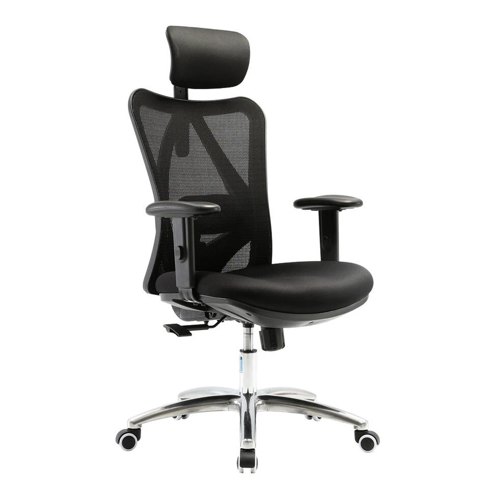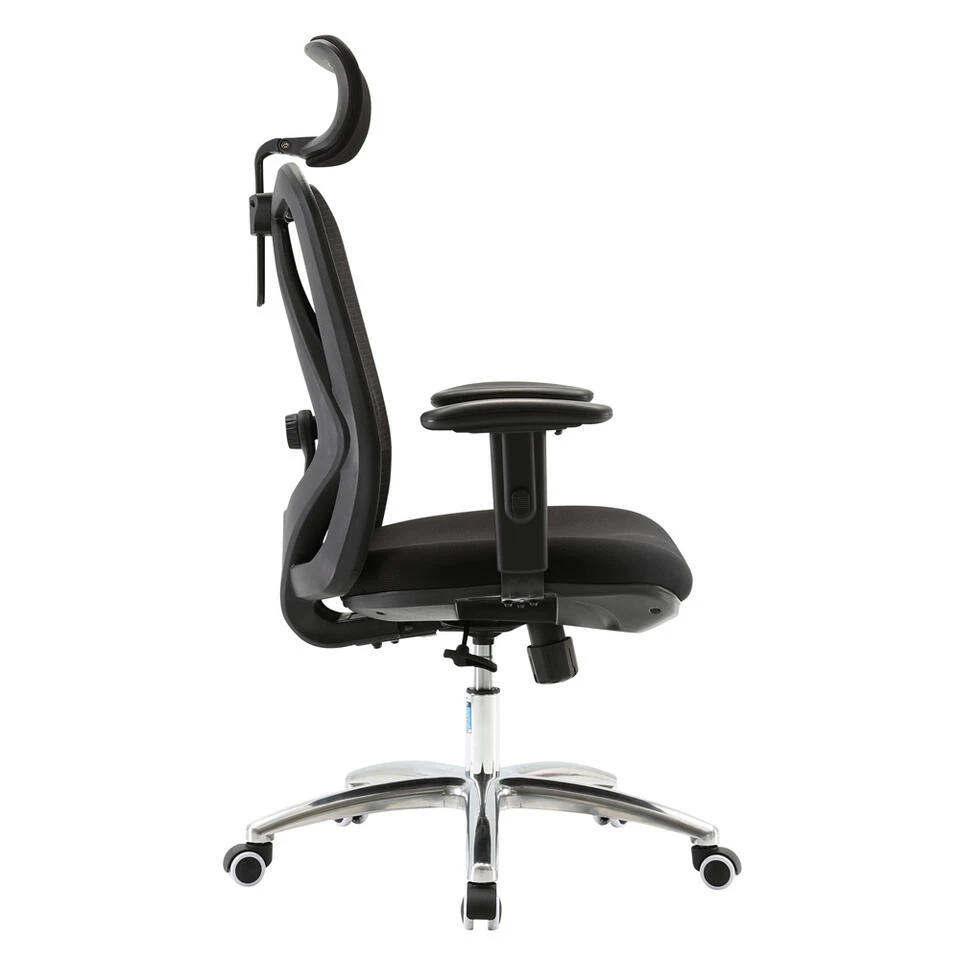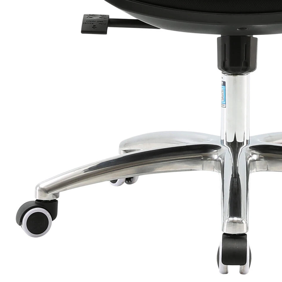 De bureaustoel is geschikt voor lange en kleine mensen. De zithoogte is namelijk traploos verstelbaar middels een gasveer die je kunt bedienen met de hendel onder de zitting. Daarnaast is de rugleuning kantelbaar, met dezelfde hendel, om een meer ontspannen houding aan te kunnen nemen. Deze kanteling is instelbaar op basis van lichaamsgewicht met behulp van de draaiknop onder de zitting. De armleuningen kunnen ook in hoogte versteld worden. De hoofd- en verstelbare lendensteun geven extra comfort tijdens een lange werkdag. Voor optimale wendbaarheid is de stoel voorzien van een 360° draaibare, aluminium stervoet met universele wieltjes.