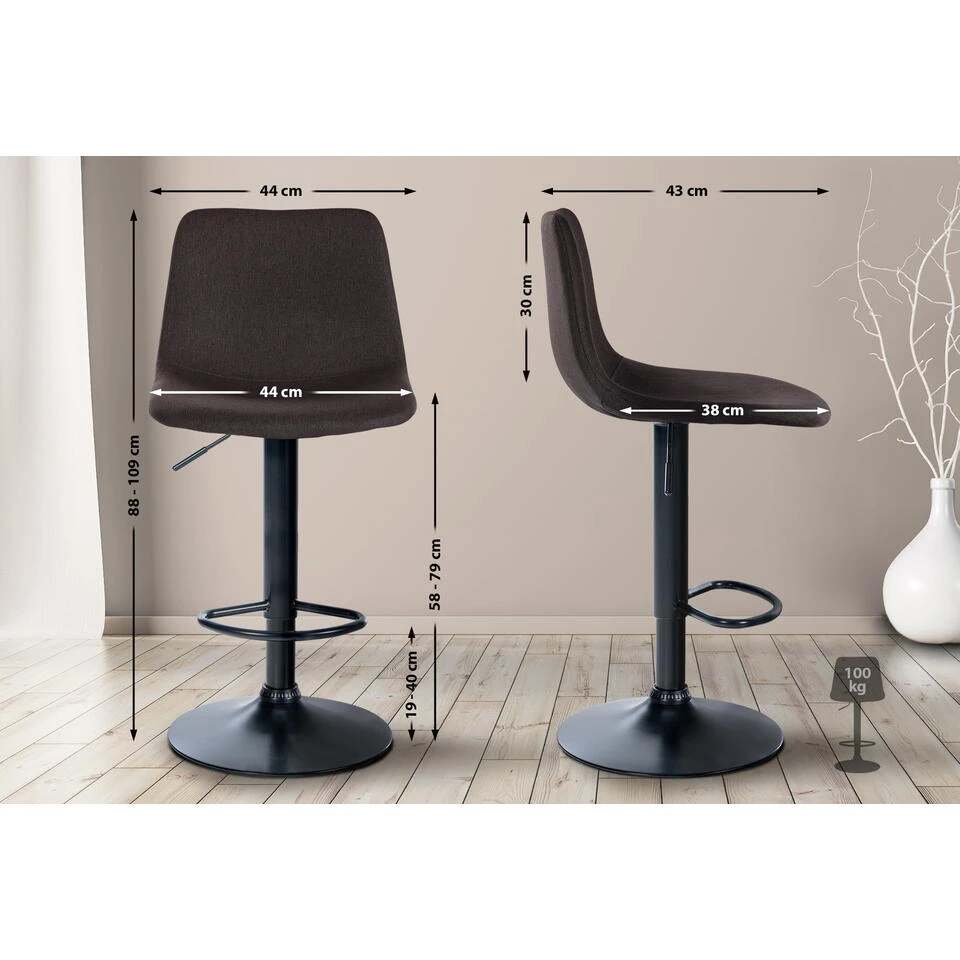 Deze moderne barkruk wordt gekenmerkt door zijn tijdloos chique ontwerp. De mooi gevormde zitting belooft een fantastische zitervaring, want de gewatteerde rugleuning geeft uw rug de nodige ondersteuning om urenlang comfortabel te zitten. De zitting is bekleed met onderhoudsvriendelijke stof en het metalen frame met trompetvoet biedt een zeer hoge stabiliteit. Dankzij de vrij te kiezen kleurencombinaties is voor elke woonsfeer de juiste barkruk te vinden. De gebogen voetsteun laat uw voeten niet hangen. De hoogte van de barkruk is traploos instelbaar door middel van een gasveer en de zitting is 360° draaibaar, waardoor hij ideaal is voor elke bar.