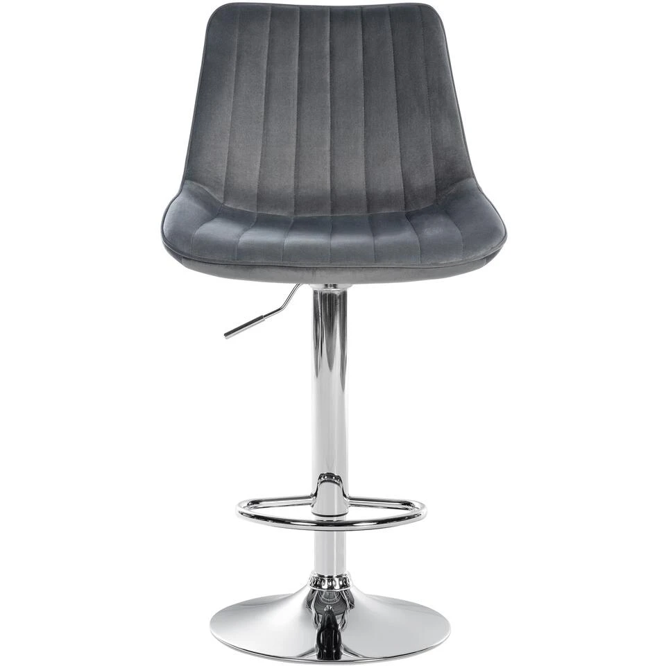 Deze moderne barkruk wordt gekenmerkt door zijn tijdloos chique ontwerp. De mooi gevormde zitting belooft een fantastische zitervaring, want de gevoerde rugleuning geeft uw rug de nodige ondersteuning om urenlang comfortabel te zitten. De zitting is gemaakt van een onderhoudsvriendelijke fluwelen bekleding en het metalen frame met zijn trompetvoet biedt een zeer hoge stabiliteit. Dankzij de vrij te kiezen kleurencombinaties is voor elke woonsfeer de juiste barkruk te vinden. De gebogen voetsteun laat uw voeten niet hangen. De hoogte van de barkruk is traploos instelbaar door middel van een gasveer en de zitting is 360° draaibaar, waardoor hij ideaal is voor elke bar.