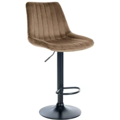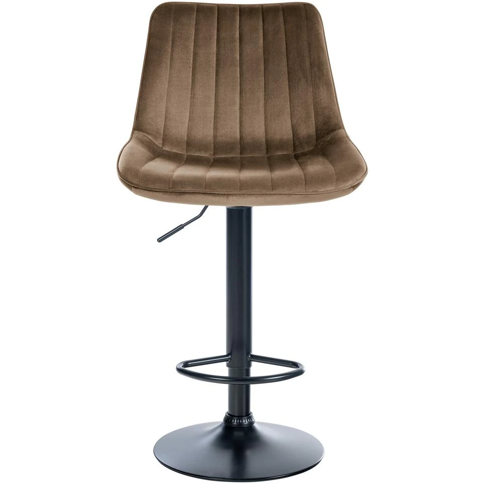 Deze moderne barkruk wordt gekenmerkt door zijn tijdloos chique ontwerp. De mooi gevormde zitting belooft een fantastische zitervaring, want de gevoerde rugleuning geeft uw rug de nodige ondersteuning om urenlang comfortabel te zitten. De zitting is gemaakt van een onderhoudsvriendelijke fluwelen bekleding en het metalen frame met zijn trompetvoet biedt een zeer hoge stabiliteit. Dankzij de vrij te kiezen kleurencombinaties is voor elke woonsfeer de juiste barkruk te vinden. De gebogen voetsteun laat uw voeten niet hangen. De hoogte van de barkruk is traploos instelbaar door middel van een gasveer en de zitting is 360° draaibaar, waardoor hij ideaal is voor elke bar.