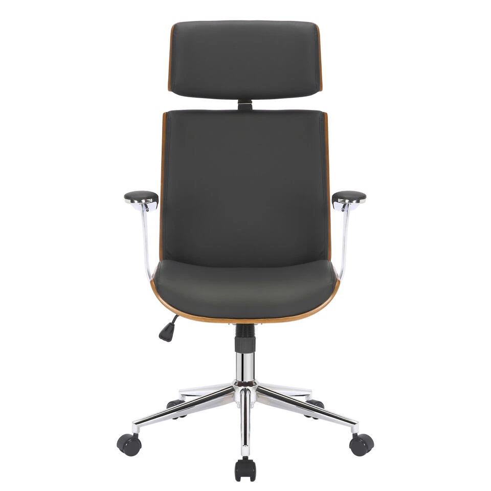 De Lester bureaustoel overtuigt niet alleen door zijn moderne look, maar ook door zijn comfort. De bureaustoel is voorzien van een royale hoofdsteun, is aangenaam gestoffeerd en heeft een kunstlederen bekleding, waardoor hij bijzonder gemakkelijk te reinigen is. De traploze hoogteverstelling en het schommelmechanisme maken het mogelijk om zelfs gedurende meerdere uren comfortabel te zitten. De stabiliteit wordt verzekerd door het metalen frame in chroomlook. De vijf licht lopende wielen maken het gemakkelijk om over de vloer te rollen, zowel op harde vloeren als op tapijt. Het elegante verchroomde frame en de mix van kunstleer en hout geven het geheel iets extra’s en maken het ontwerp helemaal af.