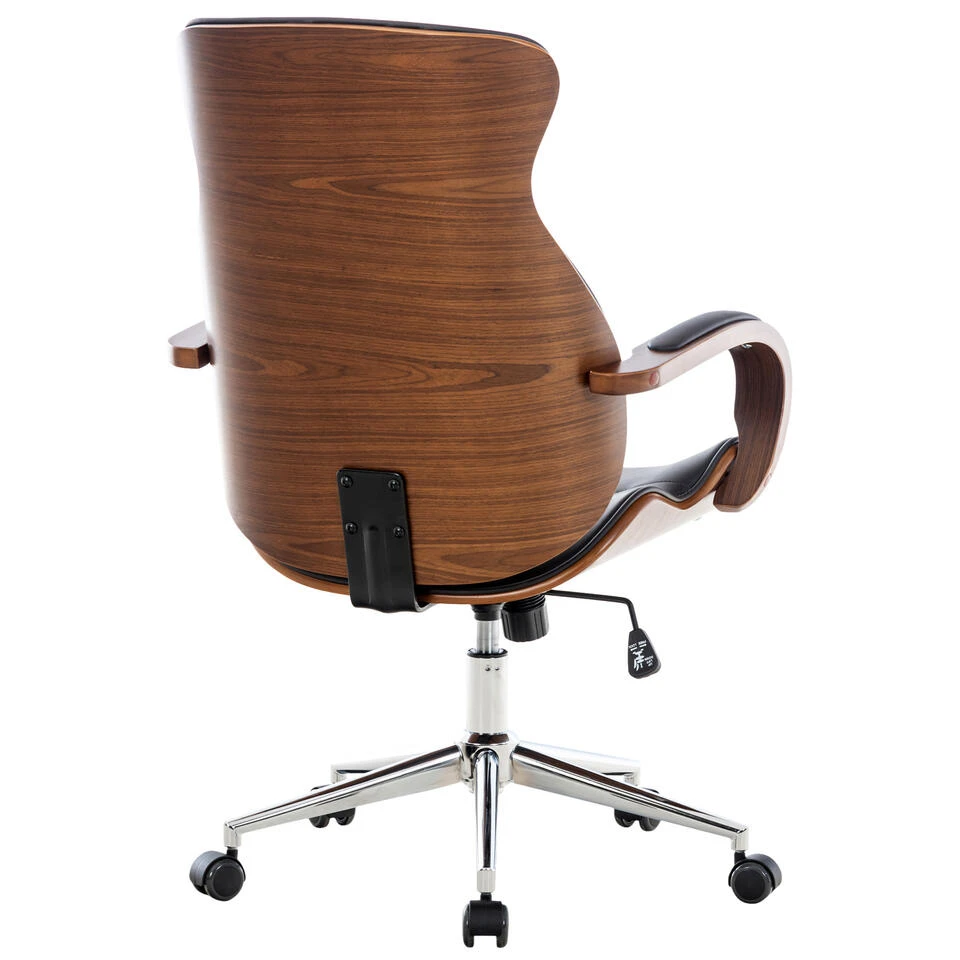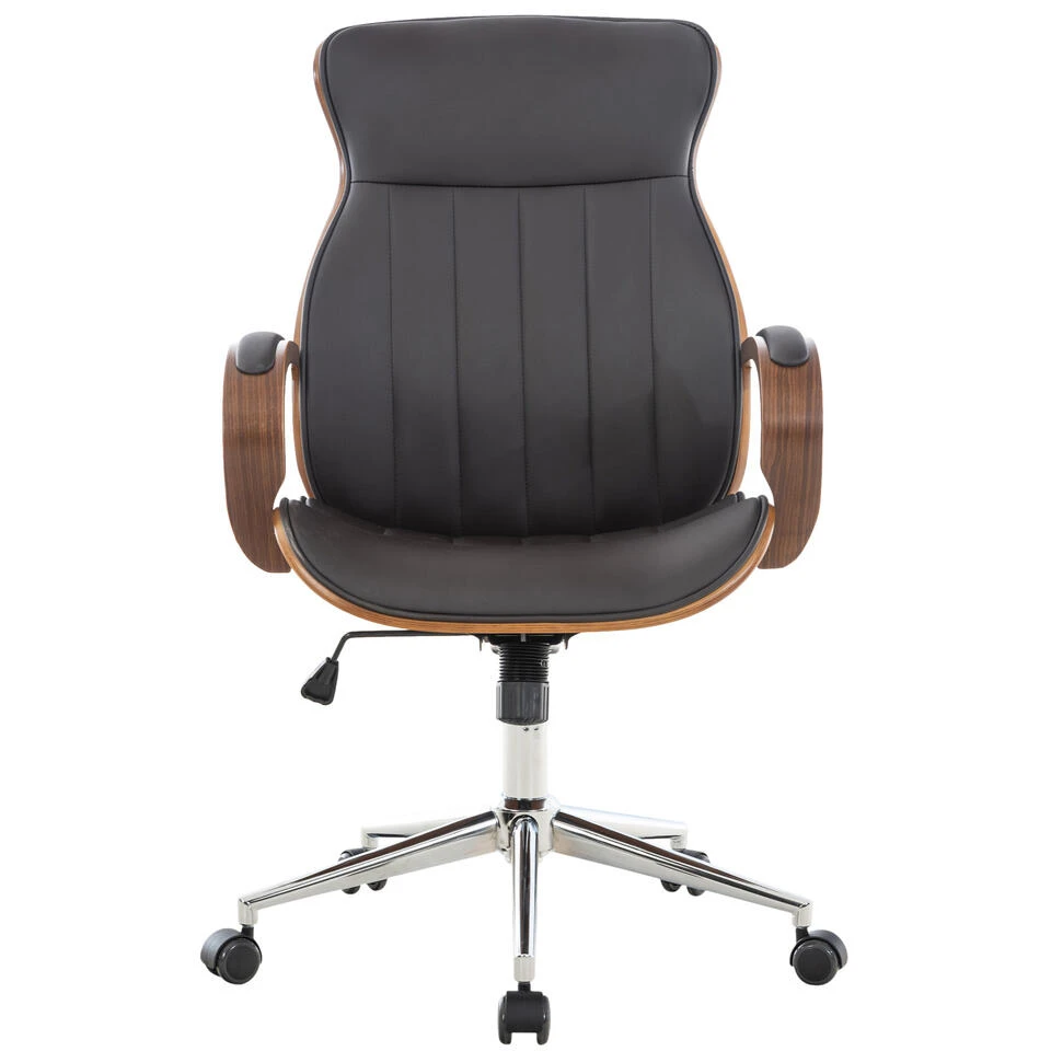 Deze bureaustoel heeft een zeer hoogwaardige kunstlederen bekleding. De kunstlederen hoes heeft het voordeel dat hij elastisch is en weer glad worden als ze ontlast worden. Dit ziet er niet alleen mooier uit, maar verlengt ook de levensduur van de stoelbekleding. Het houten frame maakt deze bureaustoel tot een absolute blikvanger en geeft hem een nobel design. Dankzij de traploze zithoogte is ergonomisch zitten gegarandeerd en zorgt het ingebouwde kantelmechanisme voor meer bewegingsvrijheid. Het frame is gemaakt van metaal in chroomlook en is zeer stabiel. De bureaustoel staat stevig op vijf zwenkwielen.
