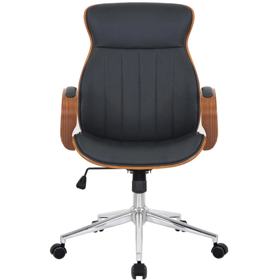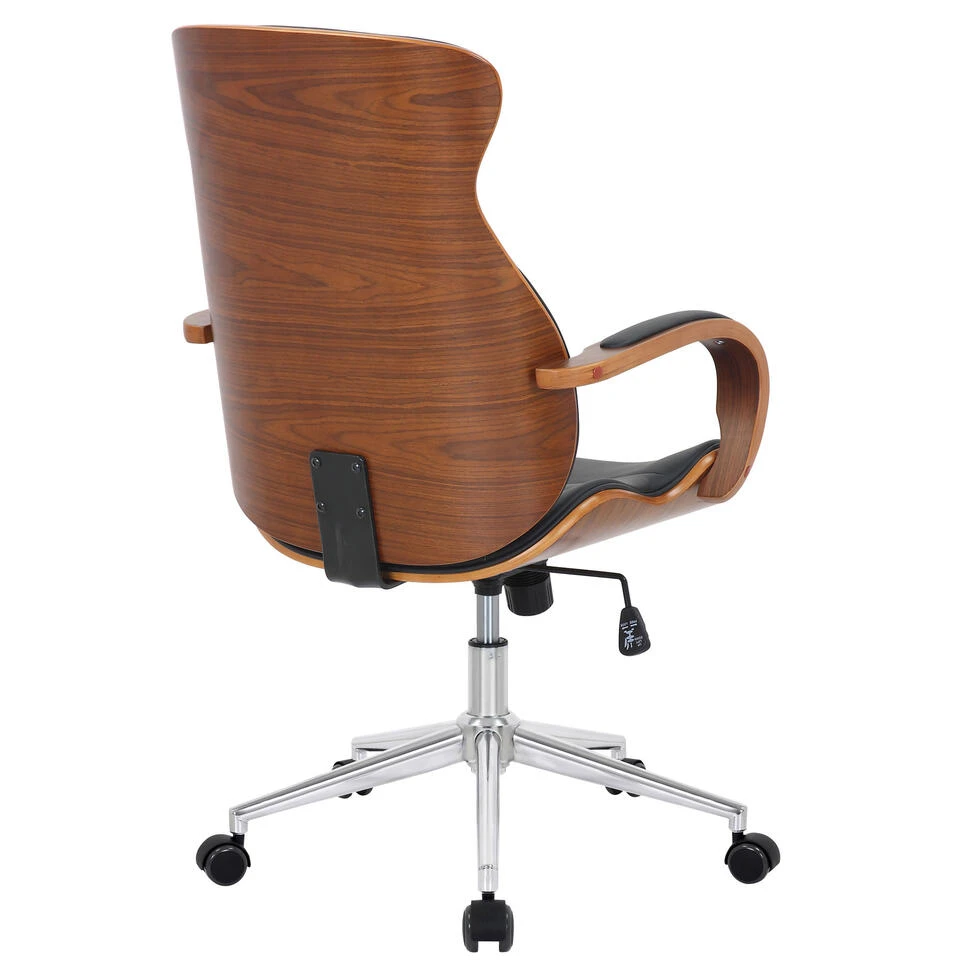 Deze bureaustoel heeft een zeer hoogwaardige kunstlederen bekleding. De kunstlederen hoes heeft het voordeel dat hij elastisch is en weer glad worden als ze ontlast worden. Dit ziet er niet alleen mooier uit, maar verlengt ook de levensduur van de stoelbekleding. Het houten frame maakt deze bureaustoel tot een absolute blikvanger en geeft hem een nobel design. Dankzij de traploze zithoogte is ergonomisch zitten gegarandeerd en zorgt het ingebouwde kantelmechanisme voor meer bewegingsvrijheid. Het frame is gemaakt van metaal in chroomlook en is zeer stabiel. De bureaustoel staat stevig op vijf zwenkwielen.