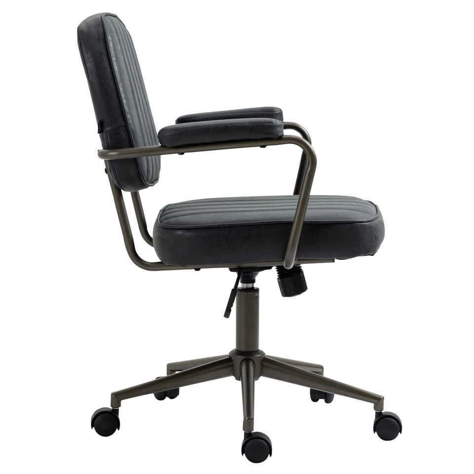 De welgevormde Natrona bureaustoel maakt niet alleen indruk met zijn kenmerkende industriële look, maar als het op comfort aankomt, kan niemand deze bureaustoel voor de gek houden. De slijtvaste kunstlederen bekleding en de hoogwaardige stoffering zorgen voor een aangename zitervaring gedurende meerdere uren. De rugleuning heeft een aangename vorm en de zithoogte van de stoel is traploos instelbaar en garandeert ergonomisch zitten. Bovendien is de bureaustoel uitgerust met een schommelmechanisme dat voor meer bewegingsvrijheid zorgt. De stabiliteit wordt verzekerd door het metalen frame in zwart. Met de vijf soepel lopende zwenkwielen kunt u gemakkelijk en losjes over de vloer rollen – of het nu gaat om harde vloeren of tapijt.