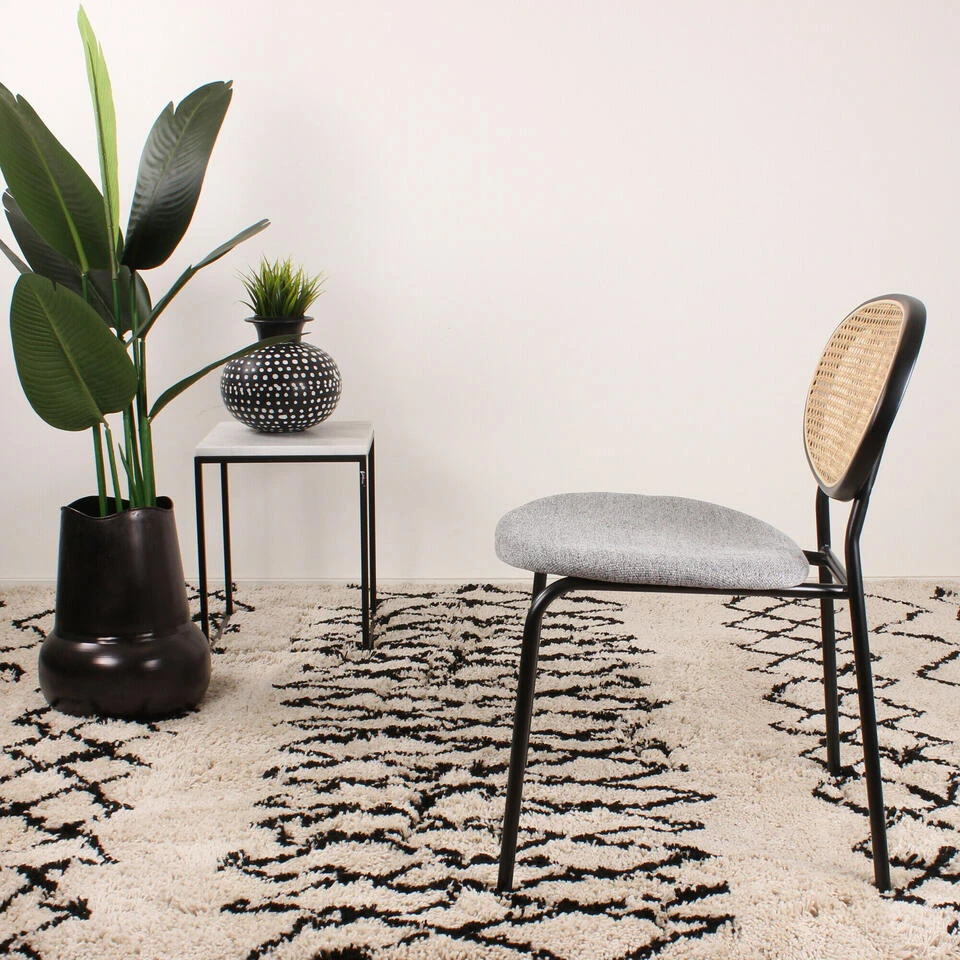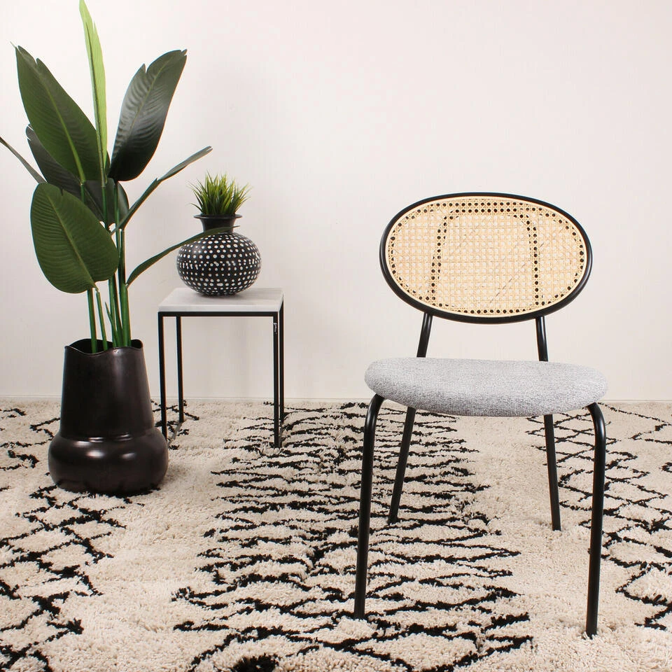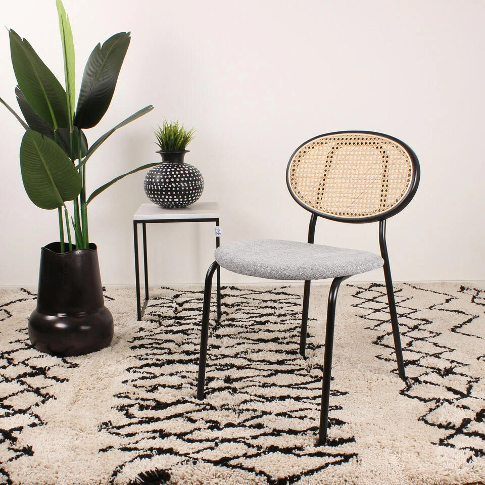 De Cherry stoel is helemaal van deze tijd. Een retro model met een eigentijdse touch. De rugleuning is gevlochten van rattan. De zitting is afgewerkt met een mooie dikke stof (polyester /100.000 martindale). Deze stoel valt op in ieder interieur vanwege zijn bijzondere design! Het onderstel bestaat uit vier stevige metalen poten met een zwarte poedercoating als afwerking en zijn voorzien van zwarte plastic beschermdopjes. Cherry is verkrijgbaar in het grijs, blauw of roze. Maximaal draaggewicht: 120 kg.