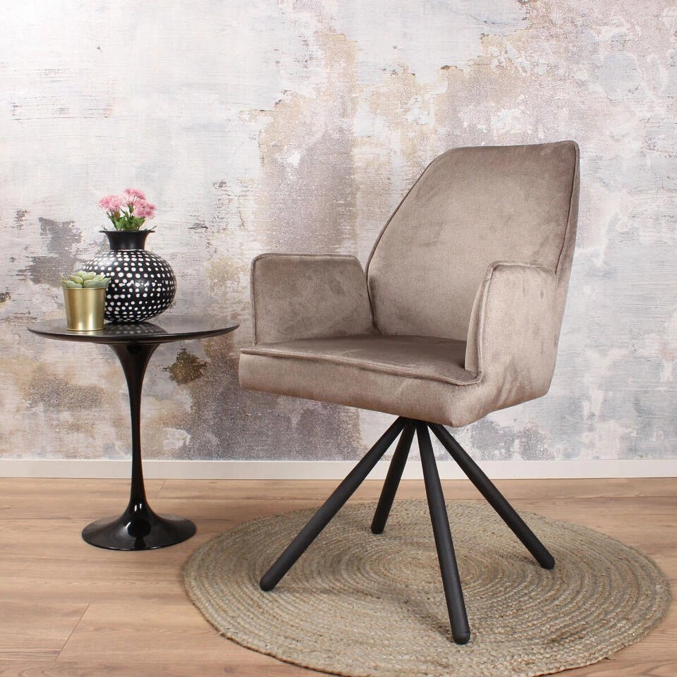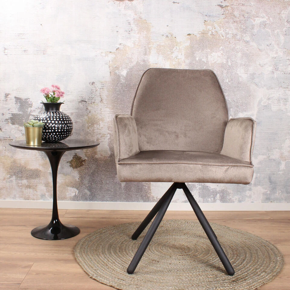 Stijlvol, comfortabel en stoer! Dat zijn de kenmerken van de Giovanna eetkamerstoel. Het bijzondere van deze eetkamerstoel is dat hij draaibaar is. De zitting van deze stoel is bekleed met sterk en zacht velours. Deze stoel staat op een stevig zwart gepoedercoat stalen onderstel in de vorm van een vierpoot. Om deze stoel extra comfort te geven is hij uitgevoerd met armleuningen. Deze stoel komt perfect tot zijn recht in een industrieel, modern, landelijk of vintage interieur. Eetkamerstoel Giovanna is verkrijgbaar in de vier populaire kleuren: donkergroen, blauw, antraciet en champagne.