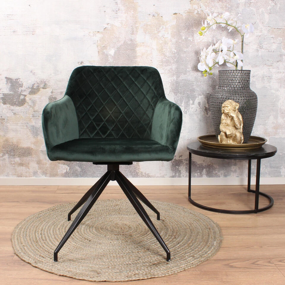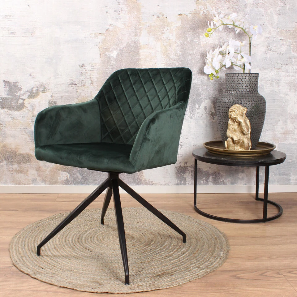 Romy armstoel velvet heeft een luxueuze uitstraling en is uiterst comfortabel. Daarnaast is deze stoel ook nog 180 graden draaibaar. Dit zorgt ervoor dat er niet met stoelen geschoven hoeft te worden. Je stapt makkelijk in en uit de stoel. Daarnaast draait de stoel zelf weer terug naar zijn oorspronkelijke positie. Ideaal! De zitting is bekleed met zacht velvet voor een fijn zitcomfort. De rugleuning is voorzien van een geruit stiksel. Romy is verkrijgbaar in vier hippe kleuren: champagne, zwart, groen en goud. De stoel staat op een stevige vierpoot van zwart gepoedercoat staal. Doordat Romy voorzien is van armleuningen is het mogelijk uren na te tafelen met je favoriete tafelgasten.