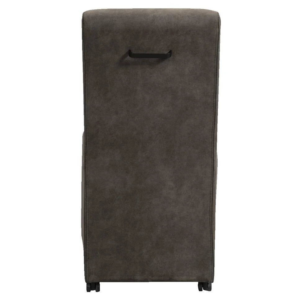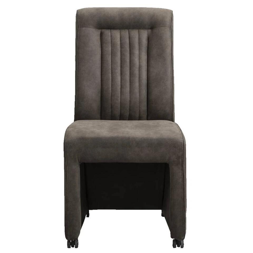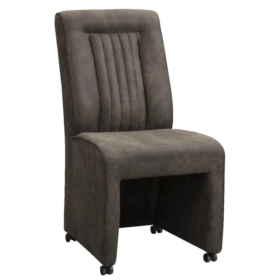 Eetkamerstoel Chase is een stoel met uitstraling. De stoel is bekleed met een grijze leatherlook preston stof. Deze stof is van een stevige kwaliteit en is gemakkelijk schoon te maken. De eetkamerstoel heeft handige wieltjes en op de rugleuning een zwart handvat. De stoel is dus makkelijk te verplaatsen zonder geschuif over de vloer.