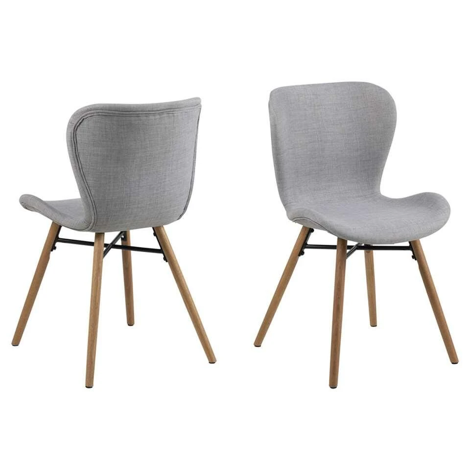 Deze eetkamerstoel is vakkundig gestoffeerd en heeft een lichtgrijze kleur.