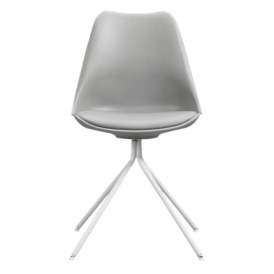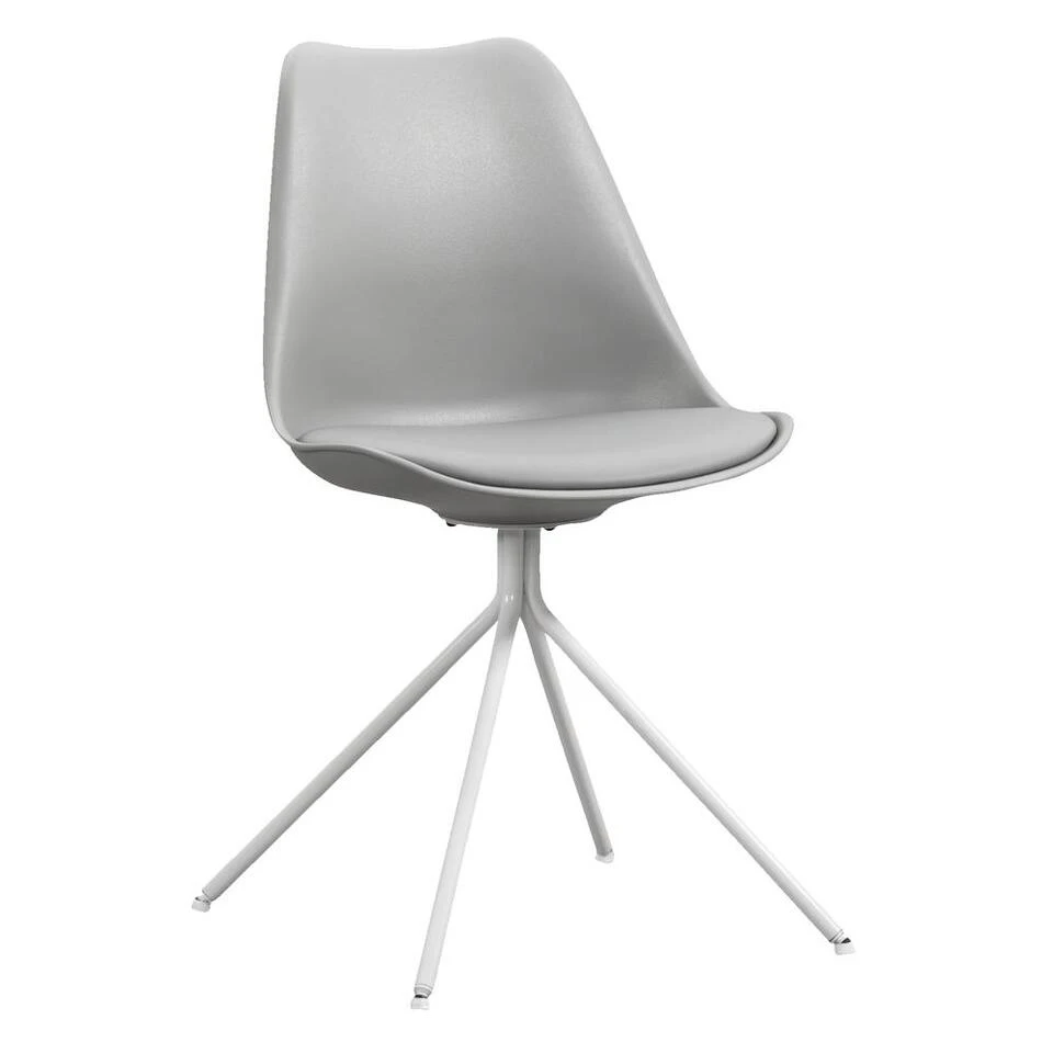 Eetkamerstoel Senja is grijs met een wit metalen onderstel. Deze moderne stoel is gemaakt van kunststof, dus gemakkelijk te reinigen met een vochtig doekje.
