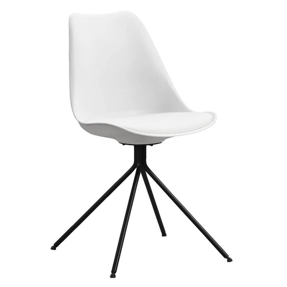 Eetkamerstoel Senja is wit met een zwart metalen onderstel. Deze moderne stoel is gemaakt van kunststof, dus gemakkelijk te reinigen met een vochtig doekje.