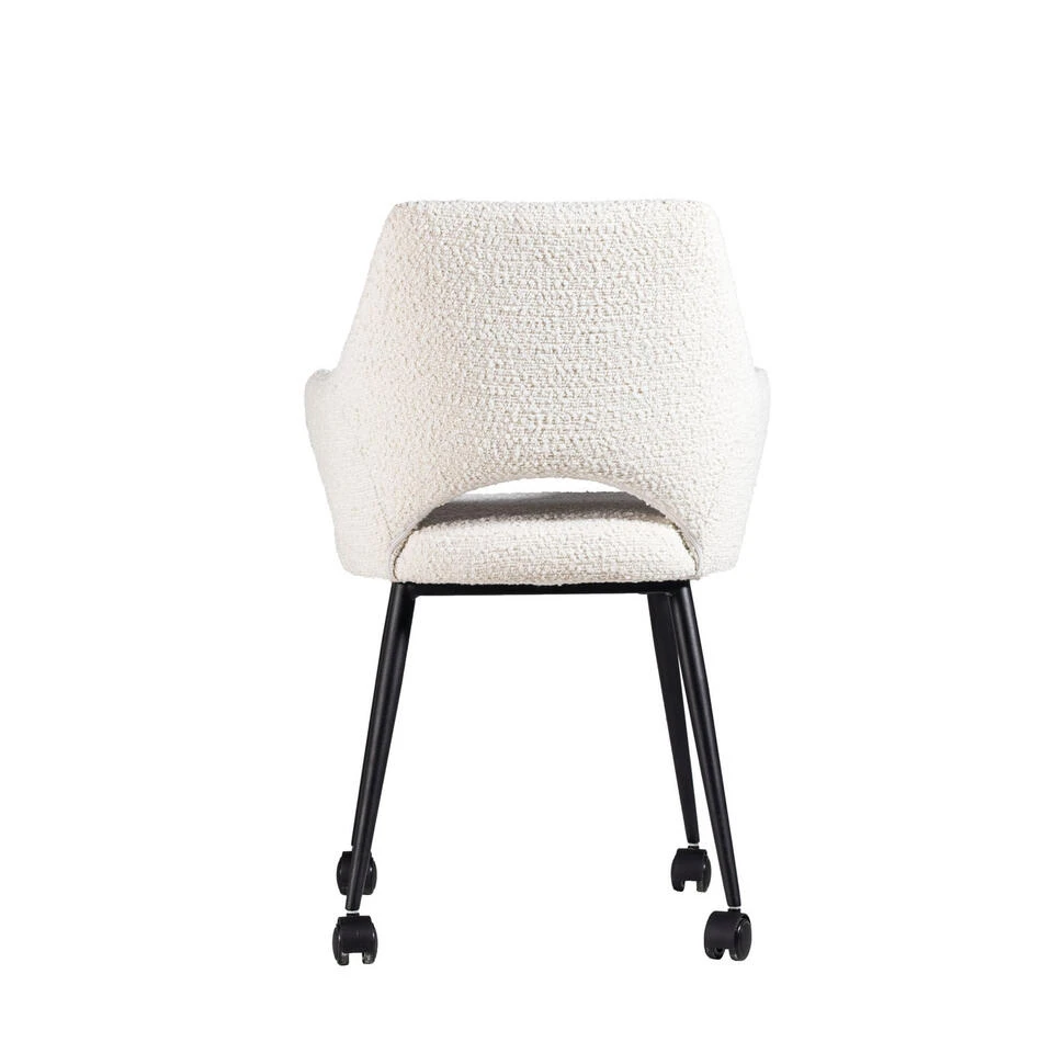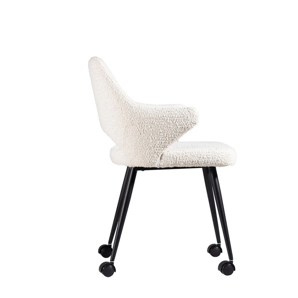 De Eetkamerstoel Jasmine Bouclé is een prachtige toevoeging aan elke eetkamer. De stoel is gemaakt van hoogwaardig bouclé materiaal en heeft een stijlvolle afwerking. Het zitgedeelte is comfortabel en ondersteund door een stevig frame. De Jasmine is perfect voor zowel formele als informele diners en zal zeker indruk maken. Bovendien is de stoel gemakkelijk te onderhouden en eenvoudig te combineren met andere meubels in de kamer. Met de wieltjes kunnen de stoelen makkelijk al rollend verplaatst worden. Kortom, de Eetkamerstoel Jasmine Bouclé is een uitstekende keuze voor wie op zoek is naar een elegante en comfortabele toevoeging aan de eetkamer.