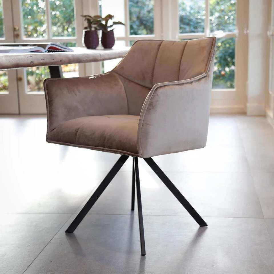 Deze eigentijdse armstoel is uitgevoerd in velvet. Velvet is een glanzende en fijne stof die bekend staat om haar flexibiliteit en sterkte. De stoel beschikt over een hele comfortabele zitting en is voorzien van een draaimechanisme. Deze stoel geeft aan ieder huis een chique en trendy look.