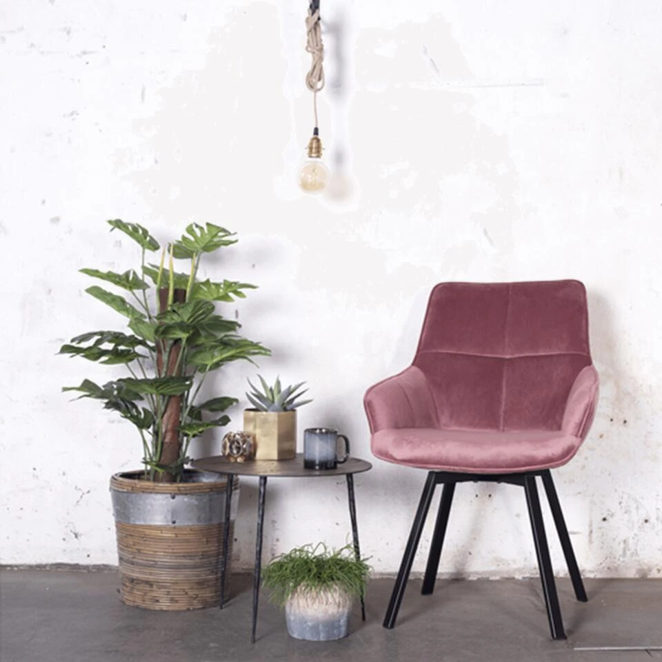 Met deze stoel zit je altijd comfortabel. De rug- en armleuningen van de stoel zijn bekleed met een velvet stof. Velvet is de trend van dit moment. De poten zijn gemaakt van staal met zwarte poedercoating. Doordat de stoel draaibaar is en een makkelijke vorm heeft, is deze stoel goed te gebruiken als bureaustoel, eetkamerstoel of als fauteuil in de woonkamer. De stoel is erg leuk in een industrieel, modern of urban chique interieur.