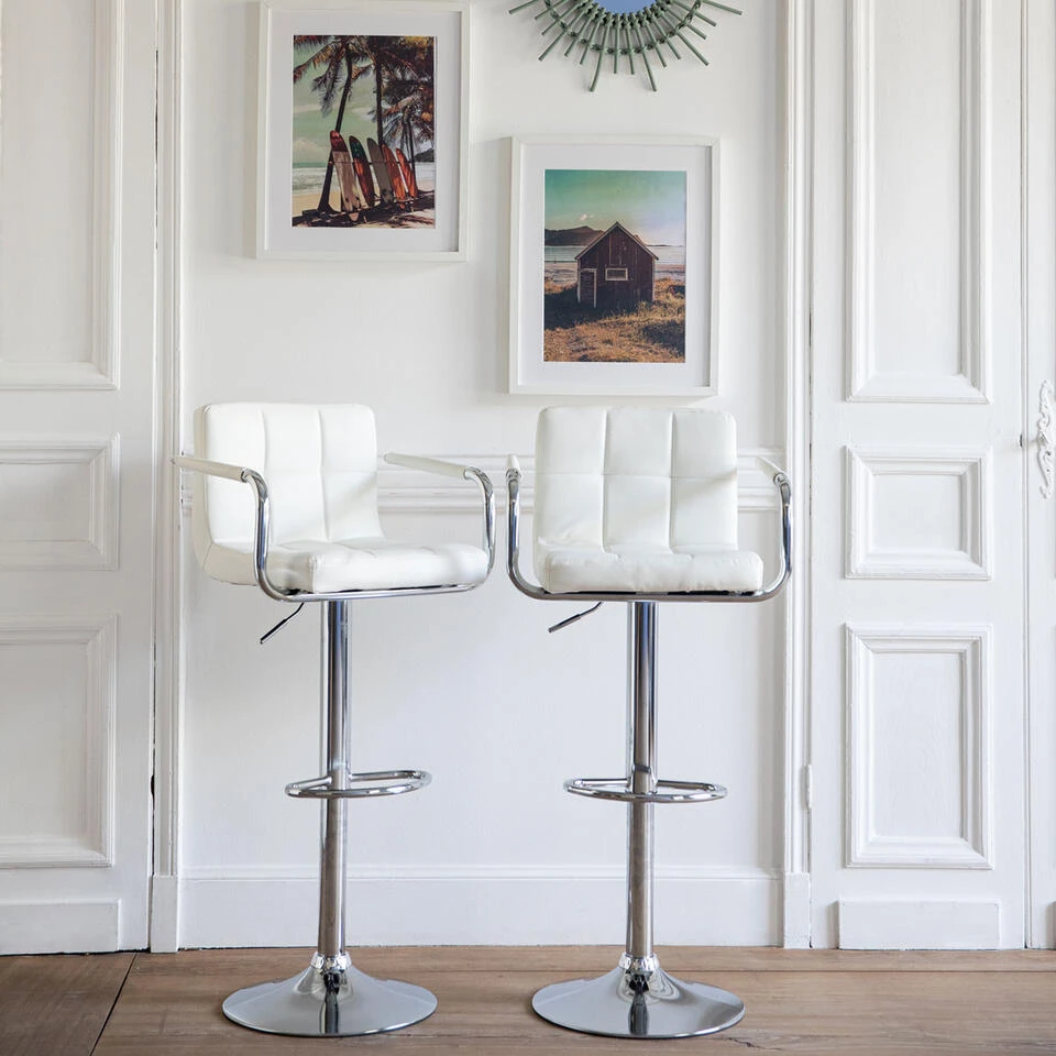 MIKE barkrukken zijn ontworpen met moderne kwaliteitsmaterialen: de combinatie van chroomstaal en wit polyurethaan geeft uw kamer een eigentijdse look zonder te beknibbelen op stevigheid. U zit comfortabel dankzij de zachte en gewatteerde zittingen, en u zit perfect dankzij de voetsteunen en armsteunen. Deze hoge krukken zijn in hoogte verstelbaar en 360° draaibaar.