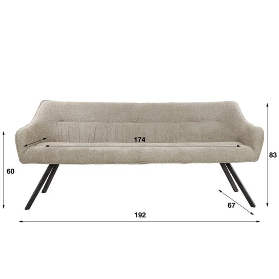 Deze eigentijdse eetkamerbank is uitgevoerd in bouclé met een metalen frame. De bank heeft een zeer comfortabele zit. De bank heeft een bijpassende eetkamerstoel.