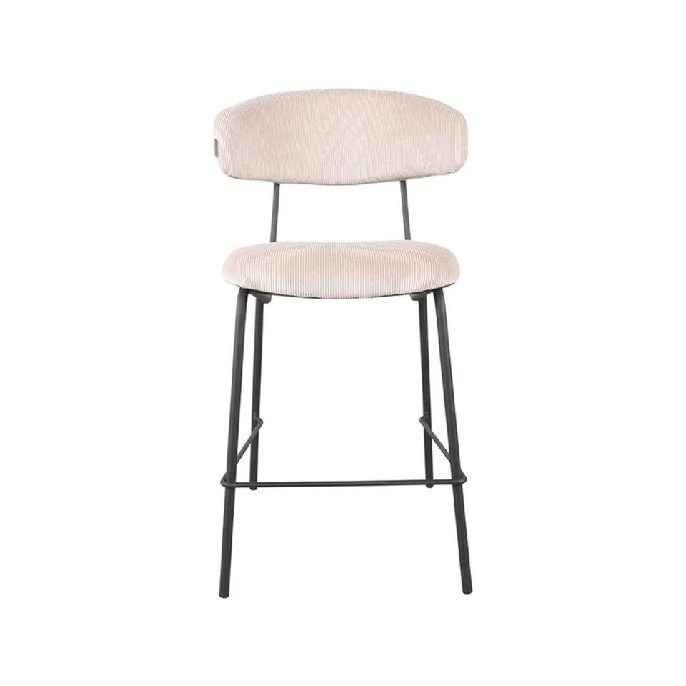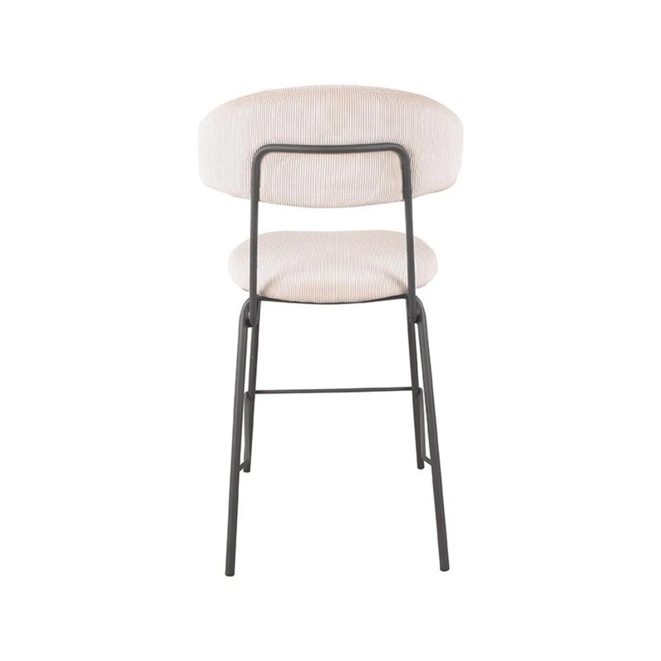 Barkruk Zack is uitgevoerd in naturel ribcord, een naturelkleurige aaibare stof. Zack bestaat uit een ronde, aparte rugleuning en zitting, die verbonden zijn door een prachtig doorlopend zwart frame, voorzien van een handgreep op de achterkant van de rugleuning. Dit maakt Zack extra functioneel waardoor het aanschuiven van deze eetkamerstoel nog makkelijker wordt. De vier zwarte poten, voorzien van een opstap zorgen voor extra stabiliteit en een luchtige look.