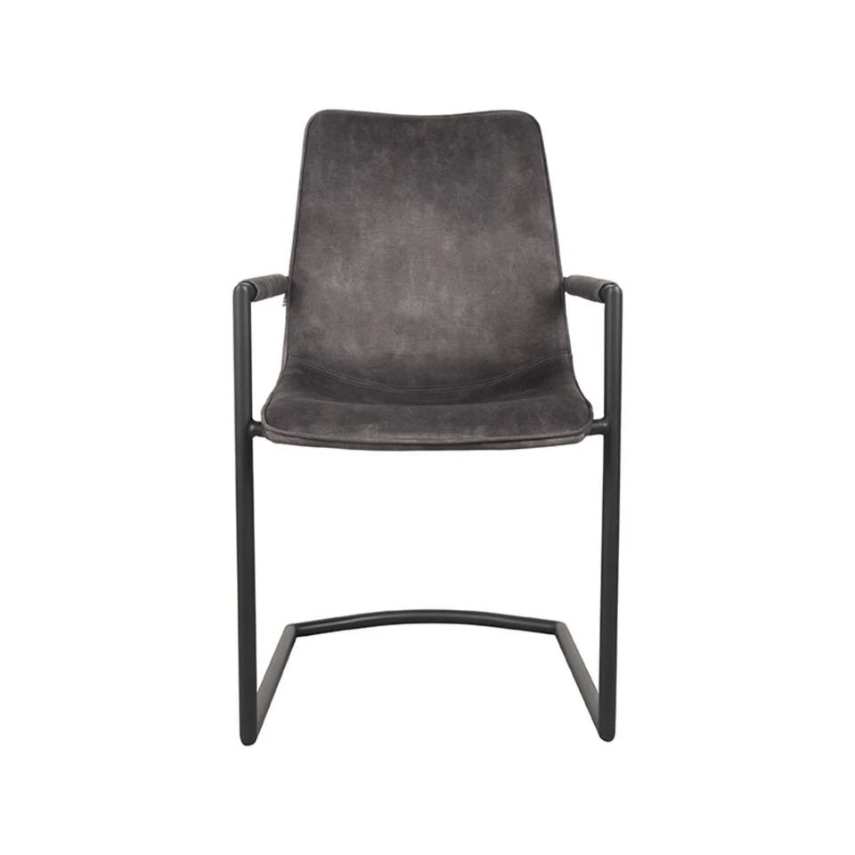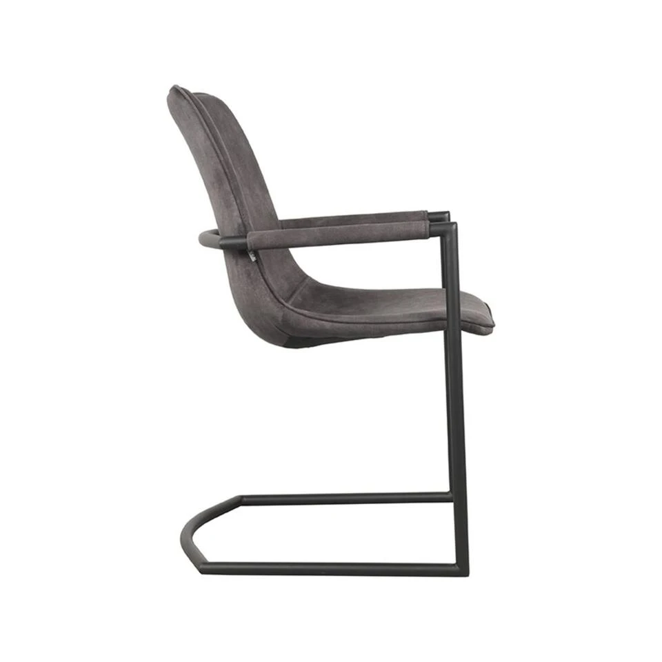 Eetkamerstoel Bodi is zo een stoel die je niet snel vergeet. Bodi heeft een tof design voorzien van fraaie details, alles klopt! Bodi bestaat uit een zwarte buisframe die vanuit de sledepoot omhoog loopt richting de armleuningen en vervolgens achter de rug doorloopt, en wel geheel geïntegreerd in de voorgevormde kuip. Bodi is gestoffeerd in een zachte antracietkleurige velourse stof, waarin tevens de armvlakken zijn uitgevoerd.