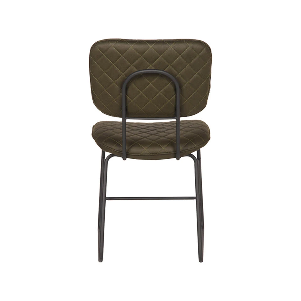 Eetkamerstoel Sev, uitgevoerd in army microvezel bestaat uit een afgeronde, aparte rugleuning en zitting, die verbonden zijn door een prachtig rond frame, voorzien van een handgreep op de achterkant van de rugleuning. Dit maakt Sev extra functioneel waardoor het aanschuiven van deze eetkamerstoel nog makkelijker wordt. Zowel de voor- en achterkant van de rugleuning als de bovenkant van de zitting zijn voorzien van een gaaf blokpatroon als stiksel, wat de stoel een speels effect geeft. Daarnaast zorgt het stiksel er op de achterkant van de rugleuning voor dat de stoel zelfs een plaatje is wanneer deze aan een eettafel geschoven staat. Sev is voorzien van een zeer stevig frame uitgevoerd in zwart metaal. Het frame zorgt voor een luchtige look.
