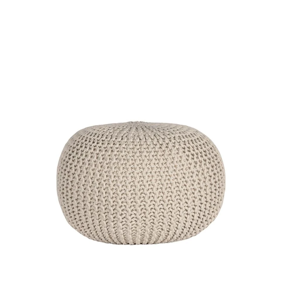 De gebreide poef, gemaakt van 100% katoen is ovaal van vorm, waarvan de doorsnede 50 cm. Hierdoor is hij ideaal te gebruiken als bijzettafel of voetenbankje.