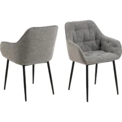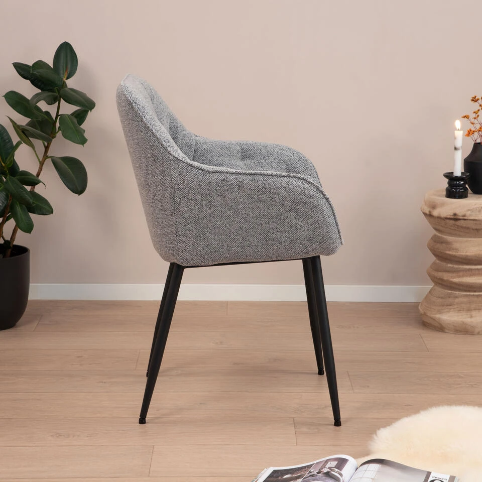 Voeg karakter toe aan je eethoek met dit tijdloze silhouet. Bekleed met een beige bouclé stof is deze eetkamerstoel geschikt voor een lang diner. Tufting details voegen textuur en structuur toe aan de zitting, die wordt ondersteund door schuine poten in een zwarte ruwe poedercoating.