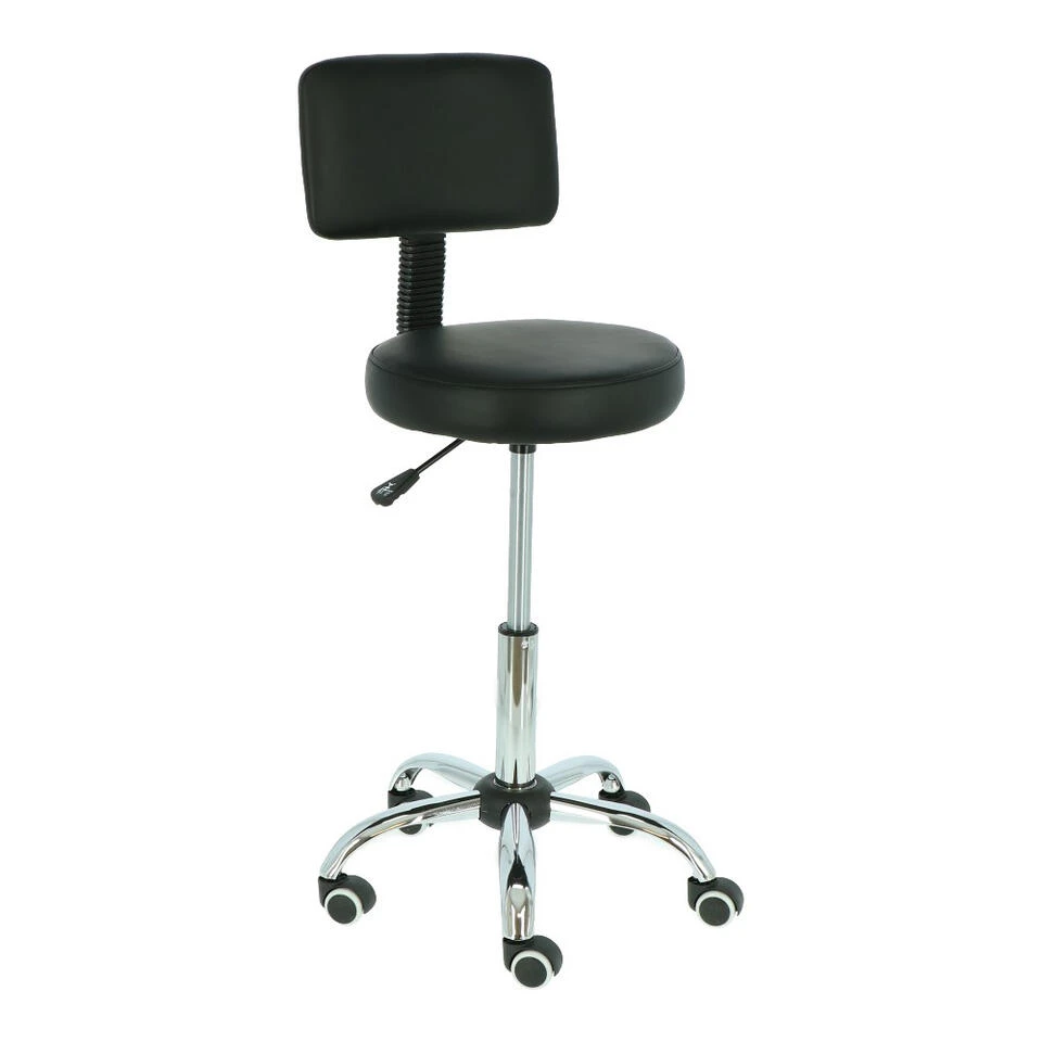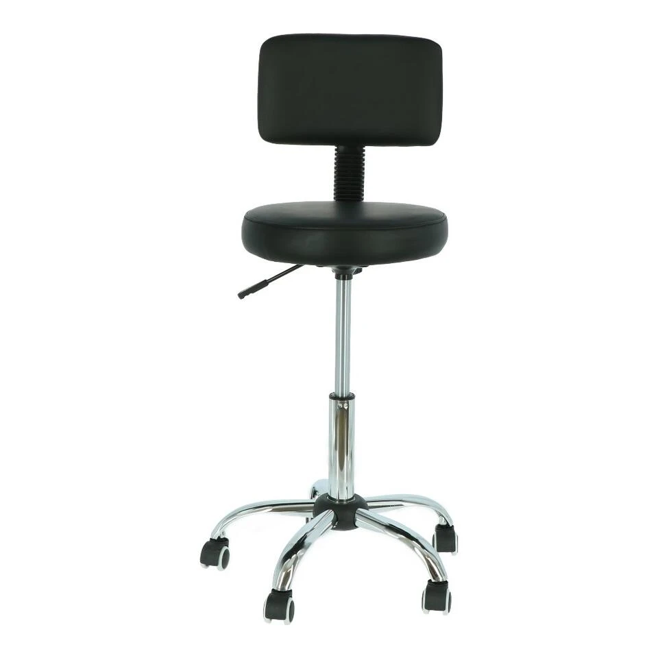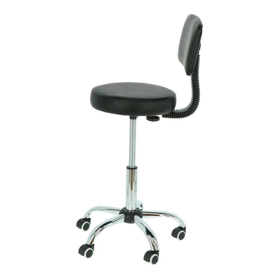 Deze tabouret heeft een zitting die voorzien is van een stevige foamvulling, bekleed met zwart kunstleer. De hoge rugleuning biedt de juiste ondersteuning, zodat je de hele dag comfortabel zittend kunt werken.