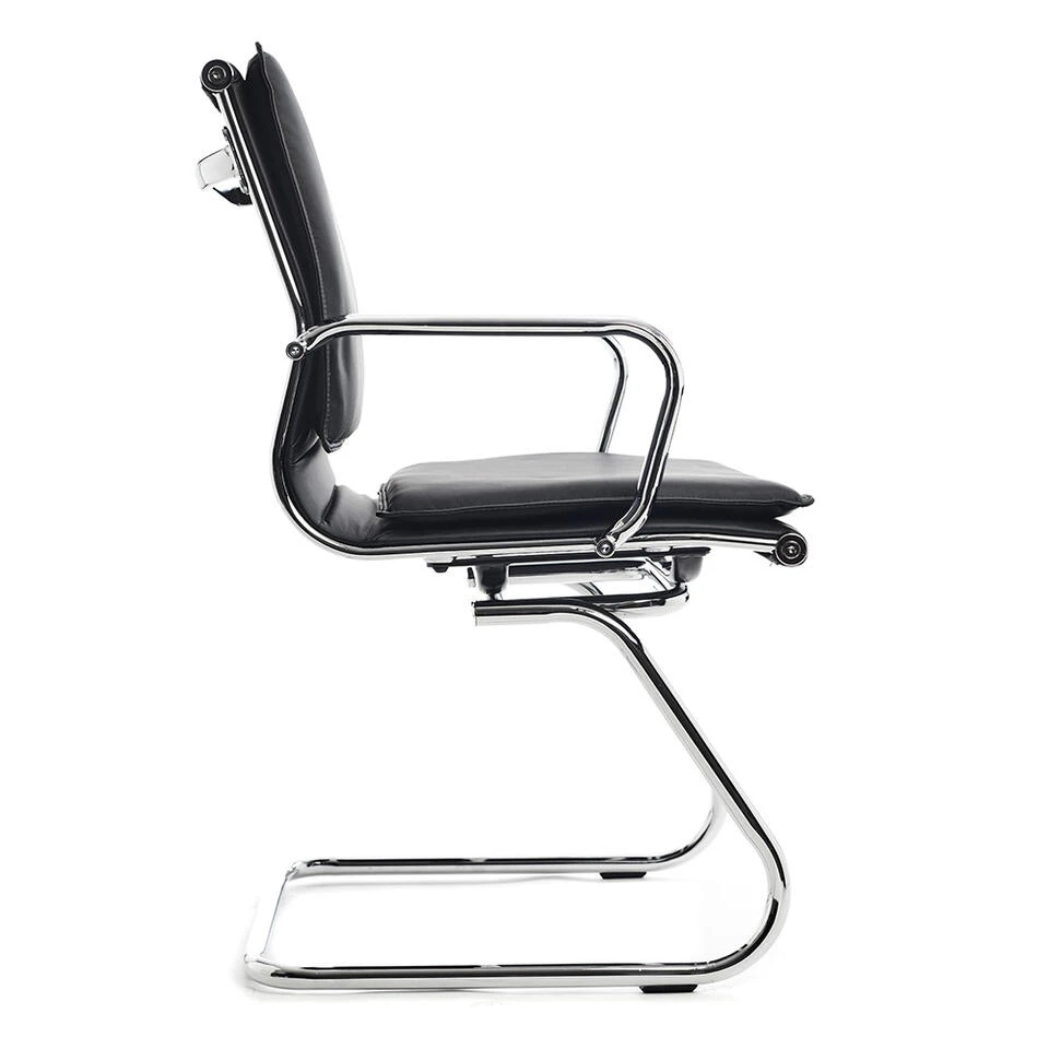 Deze comfortabele design vergaderstoel Vicenza heeft een luxueuze uitstraling door het gebruik van verchroomde elementen en zwart PU lederen bekleding. De kantoorstoel heeft een standaard zithoogte van 48 cm en een zitdiepte van 45 cm. Het onder frame is verchroomd voor een luxe en professionele uitstraling.